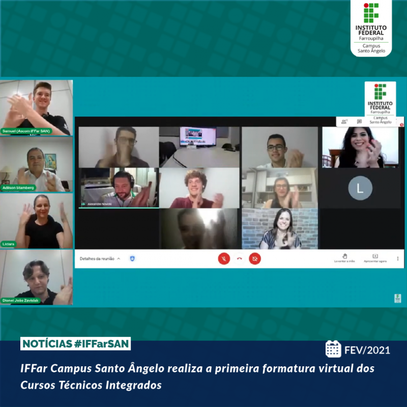 Na última sexta-feira (26) do mês de fevereiro de 2021, o IFFar Campus Santo Ângelo realizou a primeira formatura virtual dos Cursos Técnicos Integrados ao Ensino Médio. O evento foi transmitido pelo Facebook do campus e pelo canal do Youtube WebTV IFFar Canal 2 simultaneamente, registrando mais de 200 acessos. Estiveram presentes o diretor geral do campus, chefe de gabinete, assessoria de comunicação, intérpretes de LIBRAS, professores homenageados, paraninfos, patronos e oradores das turmas.