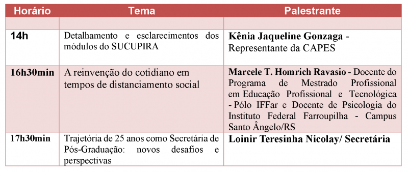 Na tarde de hoje, às 16h30min, a servidora Marcele T. Homrich Ravasio - Docente do Programa de Mestrado Profissional em Educação Profissional e Tecnológica - Pólo IFFar e Docente de Psicologia do Instituto Federal Farroupilha - Campus Santo Ângelo/RS, participa remotamente como palestrante do 3º dia de atividades do XIII Anped Sul no evento "X Fórum de Secretárias/os de Programas de Pós-graduação em Educação da Região Sul (FORSEC)".