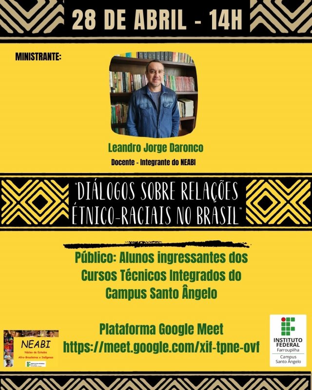 O NEABI do IFFar Campus Santo Ângelo organiza, nesta quarta-feira (28/04), a partir das 14 horas, um encontro com os alunos ingressantes dos Cursos Técnicos de Nível Médio para apresentar o papel dos Núcleos de Ações Inclusivas que são o Núcleo de Apoio a Pessoas com Necessidades Especiais - NAPNE, Núcleo de Gênero e Diversidade Sexual - NUGEDIS e Núcleo de Estudos Afro-brasileiros e Indígenas - NEABI.