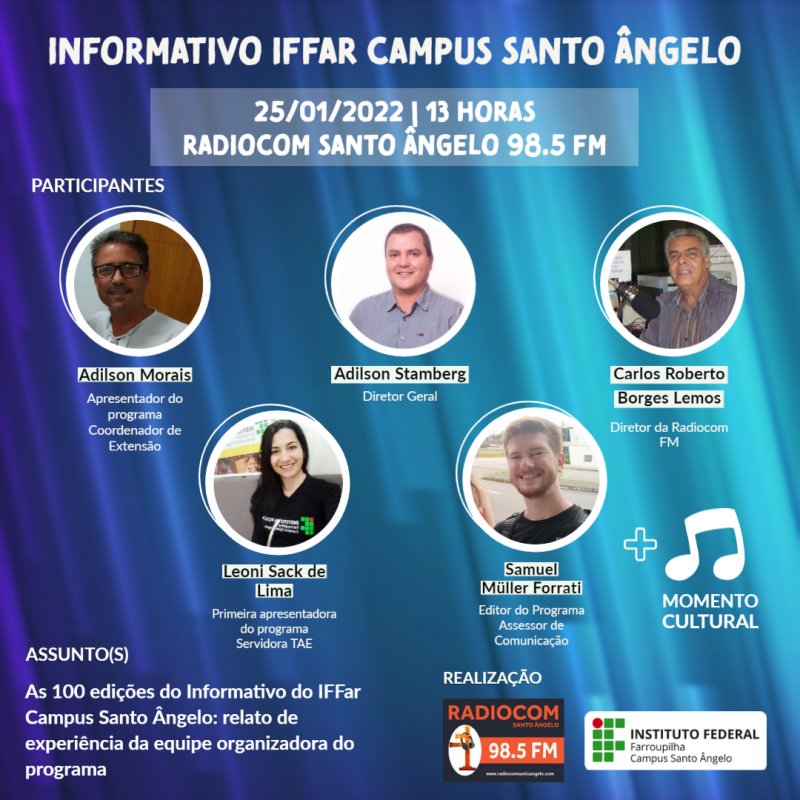 Nesta terça-feira (25/01/2022) às 13h, acompanhe AO VIVO o Informativo do IFFar SAN no seu rádio (98.5 FM), celular ou computador, através da RADIOCOM Santo Ângelo e das redes do Campus.