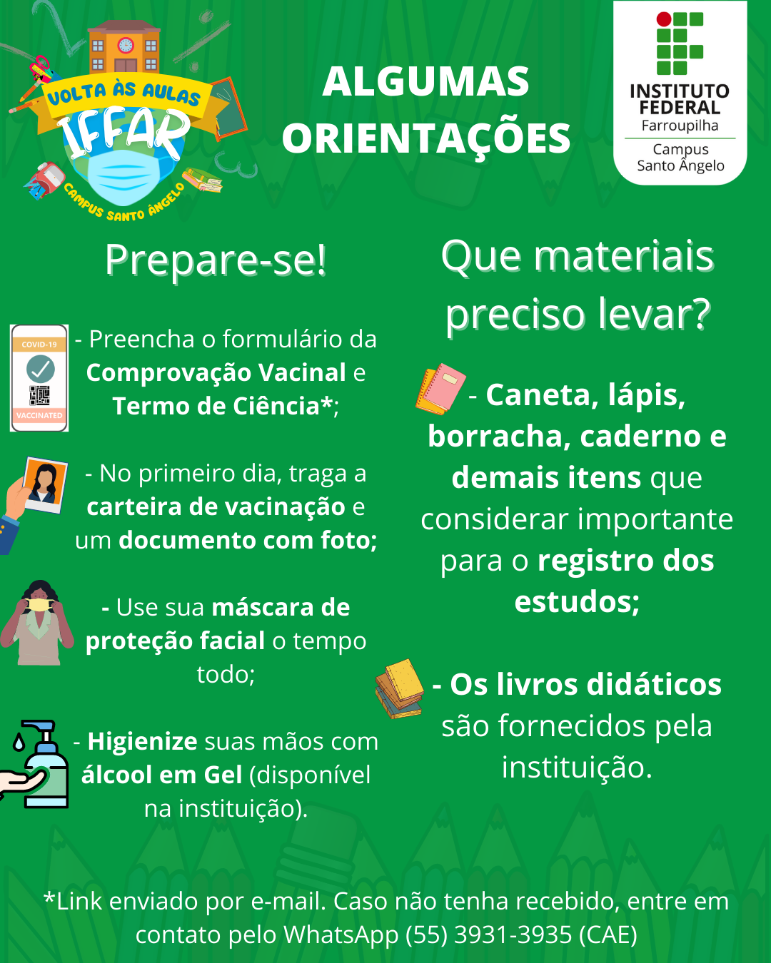 Não esqueça de preencher o formulário da Comprovação Vacinal e Termo de Ciência, eles são necessários para você acessar o Campus, caso não encontre o link no seu e-mail entre em contato pelo (55) 3931-3935. Para o primeiro dia, leve também a sua carteira de vacinação e um documento com foto!