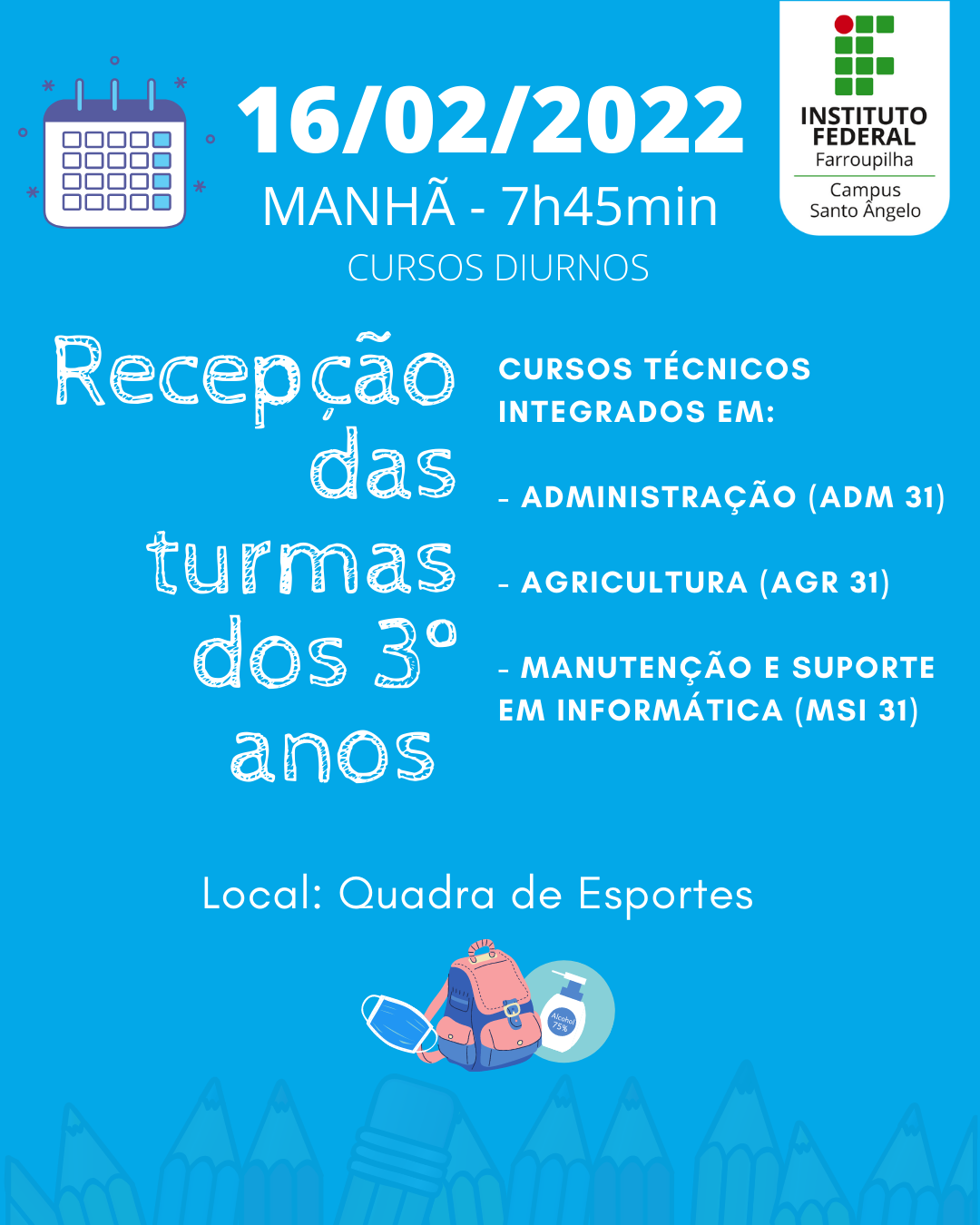 | 17/02/22 | 07h45min | Recepção das turmas dos 2º anos dos Cursos Técnicos Integrados em: Manutenção e Suporte em Informática (MSI 21), Administração (ADM 21 E 22), Agricultura (AGR 21). | Quadra de Esportes |