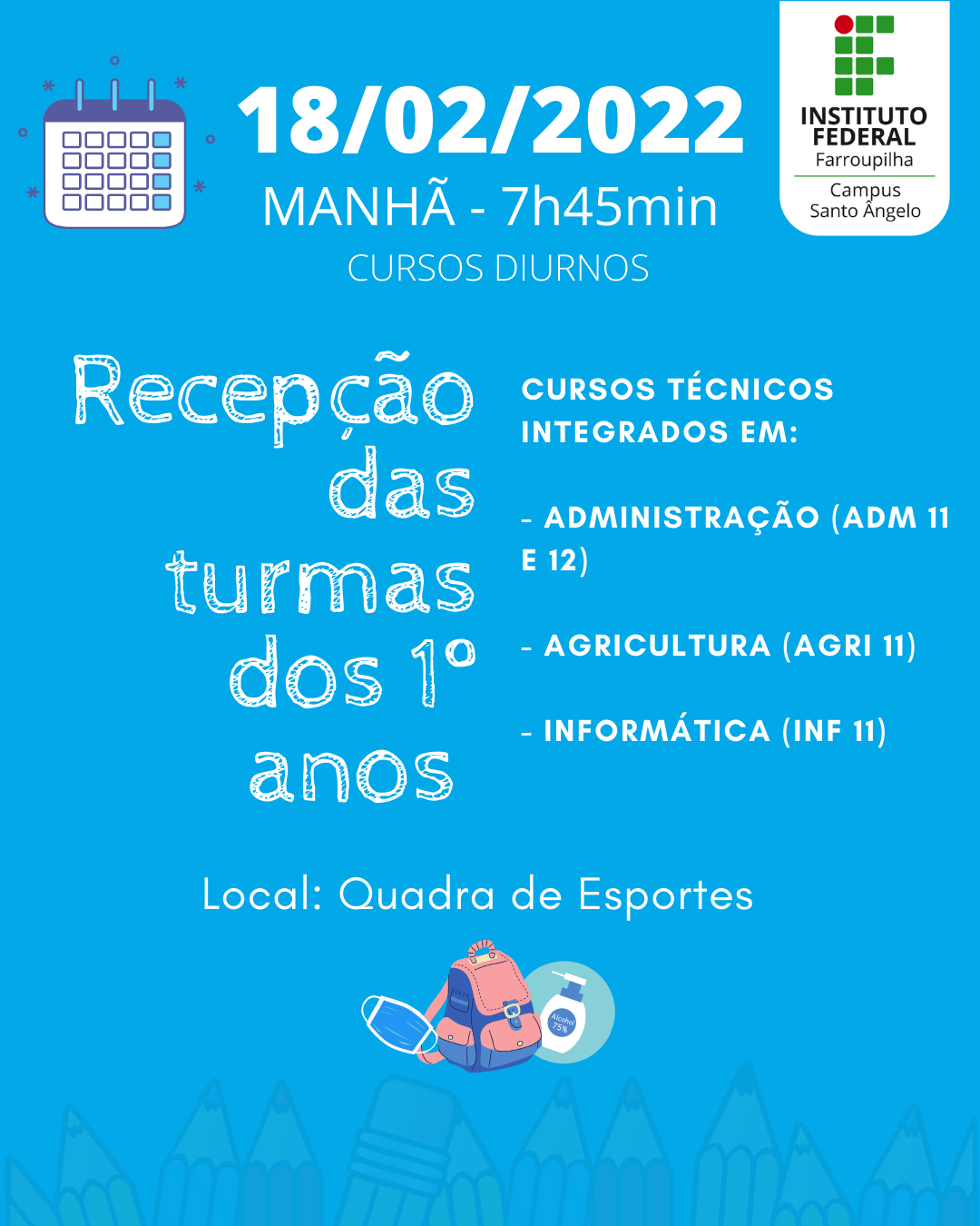 | 17/02/22 | 07h45min | Recepção das turmas dos 1º anos dos Cursos Técnicos Integrados em: Informática (INF 11), Administração (ADM 11 e 12), Agricultura (AGRI 11). | Quadra de Esportes |