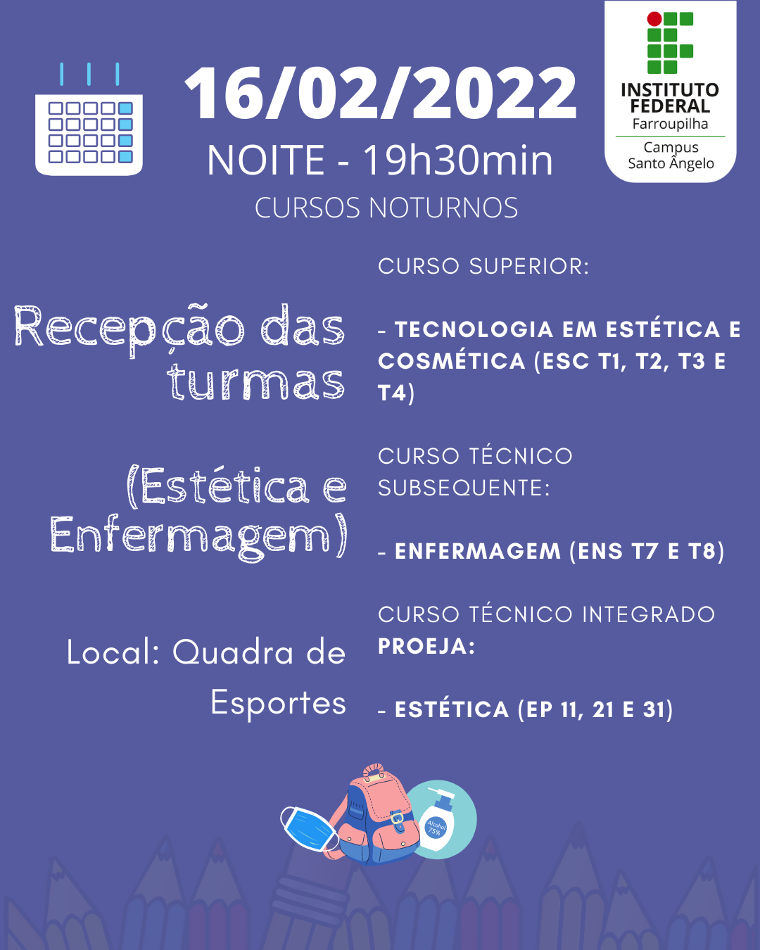 19h30min | Recepção das turmas dos Cursos de: Tecnologia em Estética e Cosmética (ESC T1, T2, T3 e T4), Técnico Integrado em Estética-PROEJA (EP 11, 21 e 31), Técnico em Enfermagem Subsequente (ENS T7 e T8). | Quadra de Esportes |