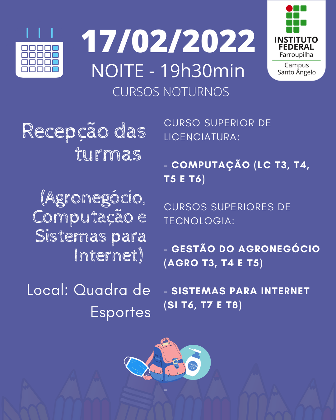 | 17/02/22 | 19h30min | Recepção para todos os alunos dos Cursos Superiores de: Tecnologia em Gestão do Agronegócio (AGRO T3, T4, T5), Licenciatura em Computação (LC T3, T4, T5 e T6), Sistemas para Internet (SI T6, T7, T8). | Quadra de Esportes |