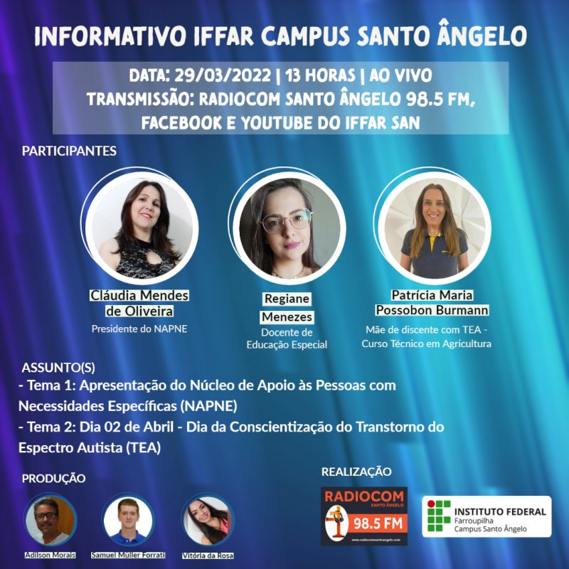 Nesta terça-feira (29/03/2022) às 13h, acompanhe AO VIVO o Informativo do IFFar SAN no seu rádio (98.5 FM), celular ou computador, através da RADIOCOM Santo Ângelo e das redes do Campus.
