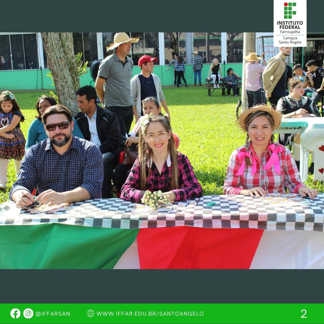 Foi realizado no dia 02 de julho das 13h às 18h no Campus Santo Ângelo. O dia estava ensolarado, com clima ameno, o que contribuiu para que acontecesse uma linda festa. Teve apresentação das quadrilhas, comidas típicas, concursos e brincadeiras. Agradecemos a todos os envolvidos na organização, aos participantes e ao público que veio prestigiar a festança.
