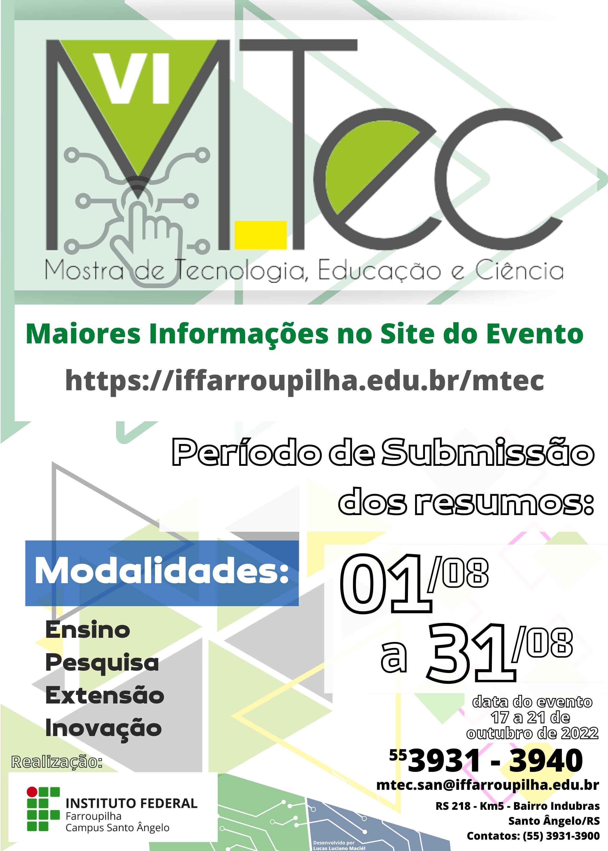 Informamos que está aberto o prazo de submissão de resumos para a VI Mostra de Tecnologia, Educação e Ciência (VI M-TEC) do Instituto Federal de Educação, Ciência e Tecnologia Farroupilha (IFFar) Campus Santo Ângelo.