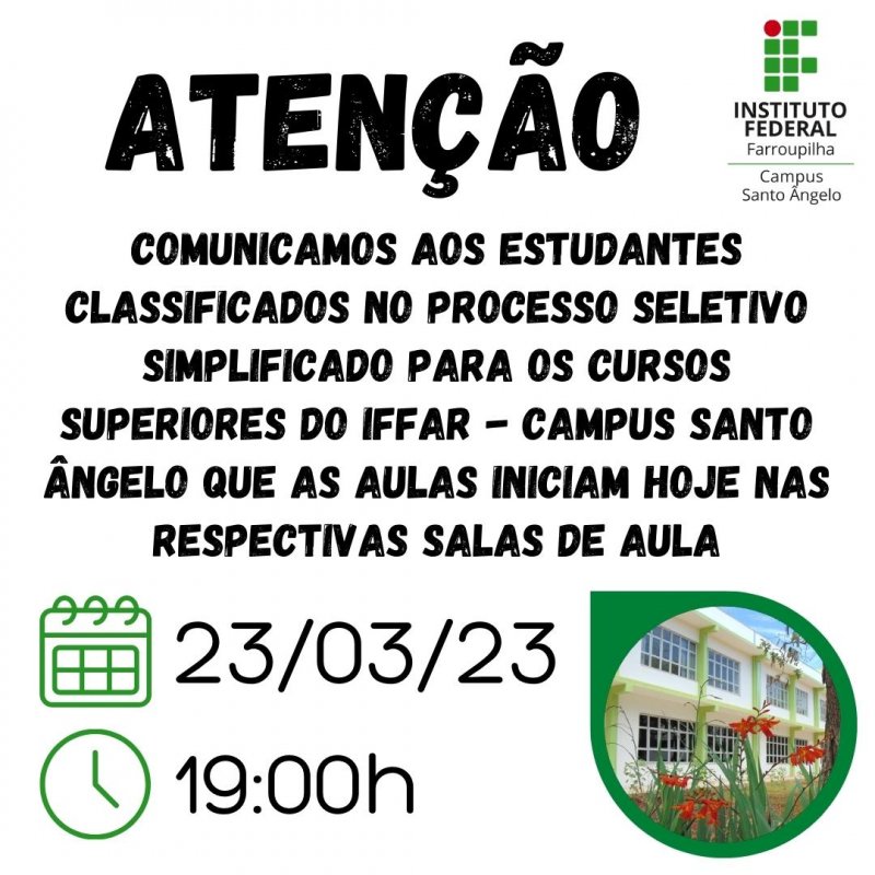 Comunicamos aos estudantes classificados no Processo Seletivo Simplificado para os Cursos Superiores do IFFar - Campus Santo Ângelo que as aulas iniciam hoje, dia 23/03/23 às 19h nas respectivas salas de aula.