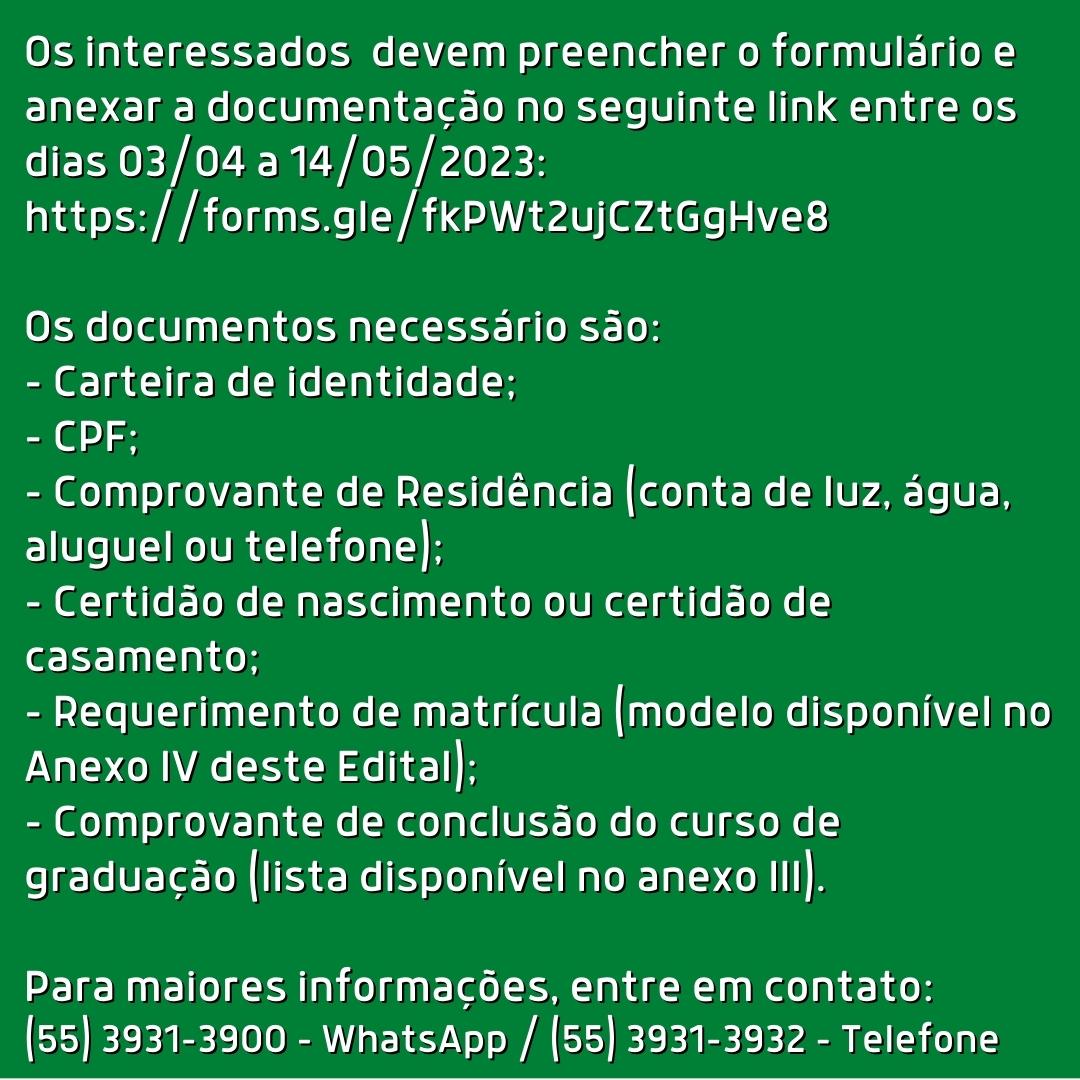 Para concorrer à vaga, o candidato deverá ser portador de diploma de Curso Superior de Graduação-Bacharelado ou Tecnologia, realizado em uma Instituição de Ensino Superior (IES)e reconhecido pelo Ministério da Educação (MEC).