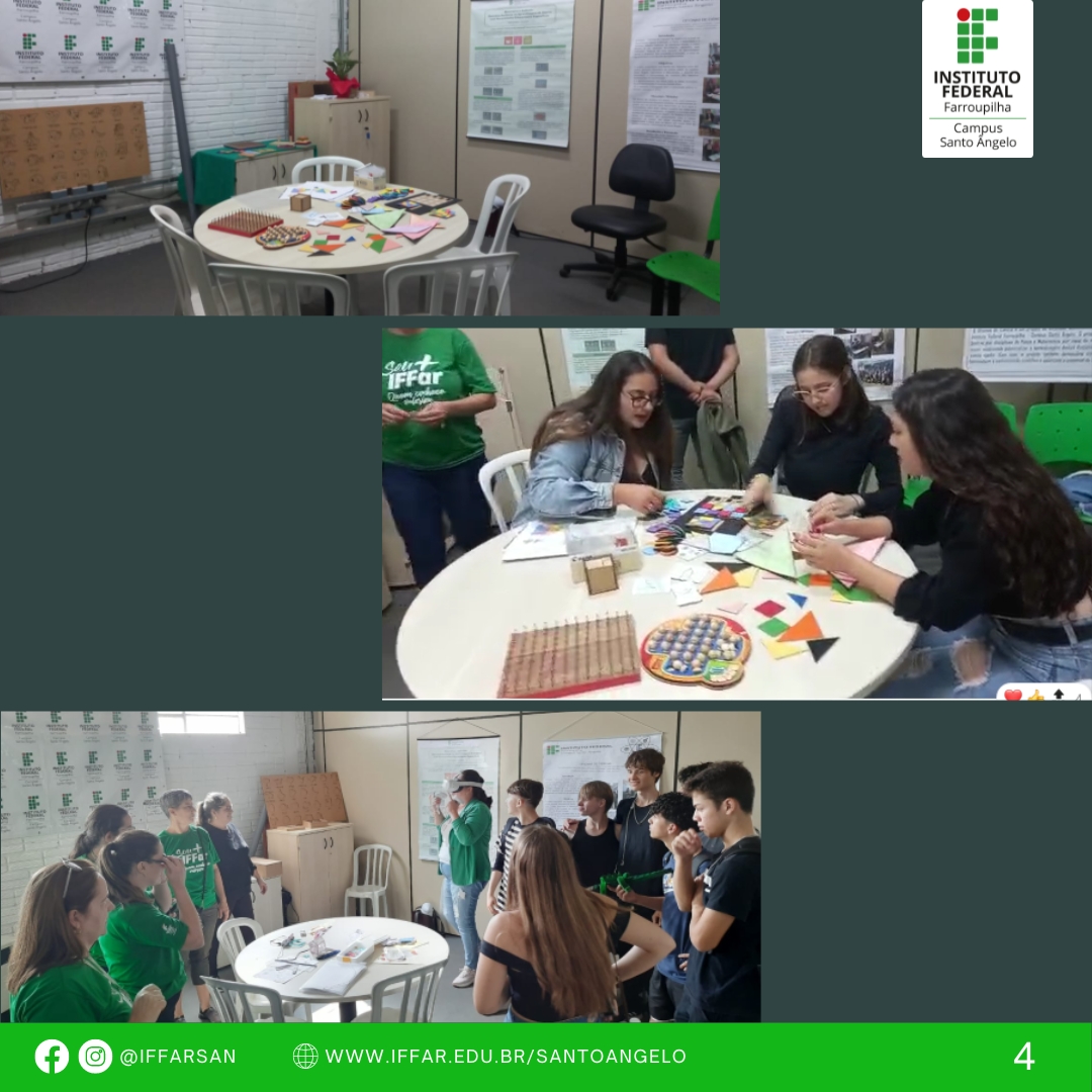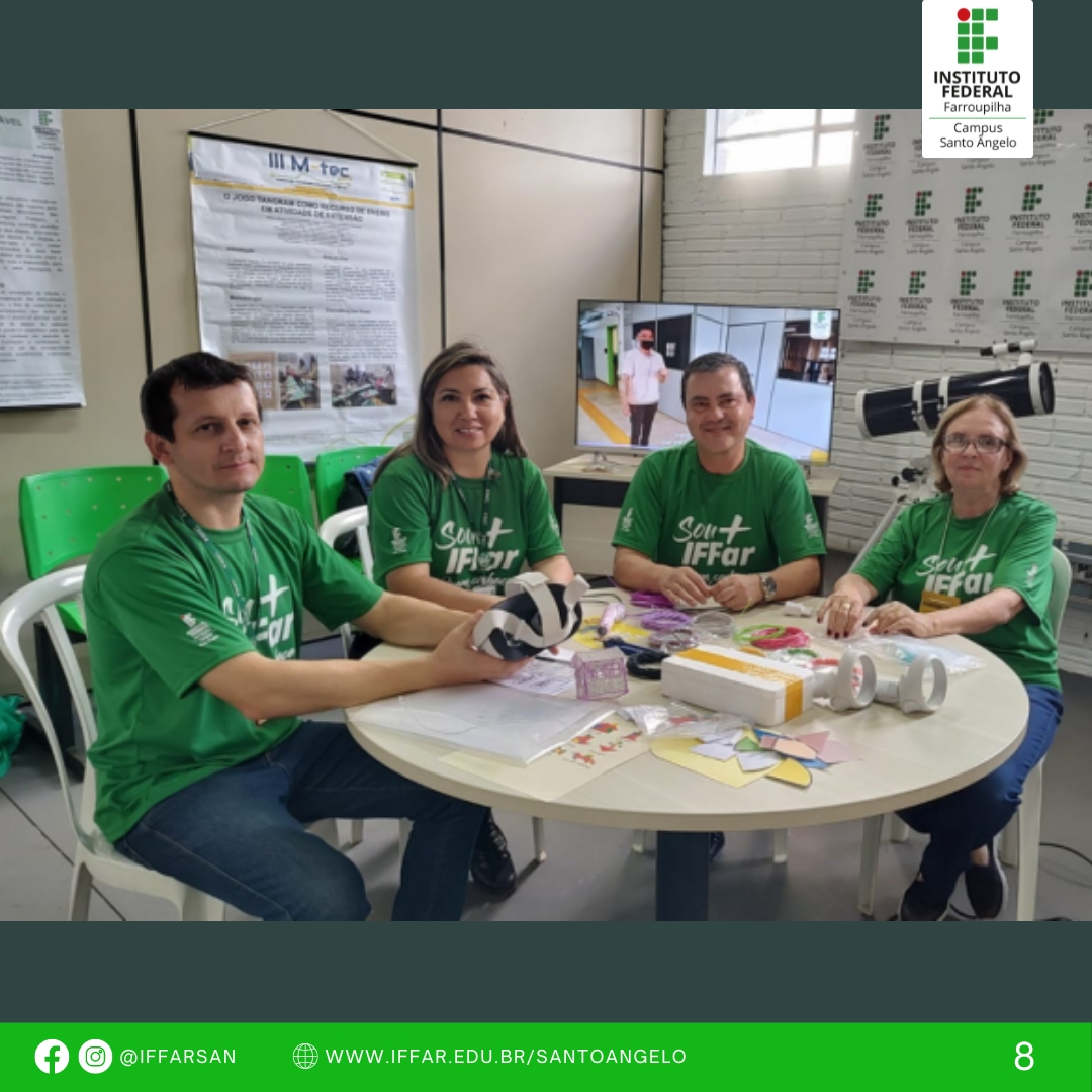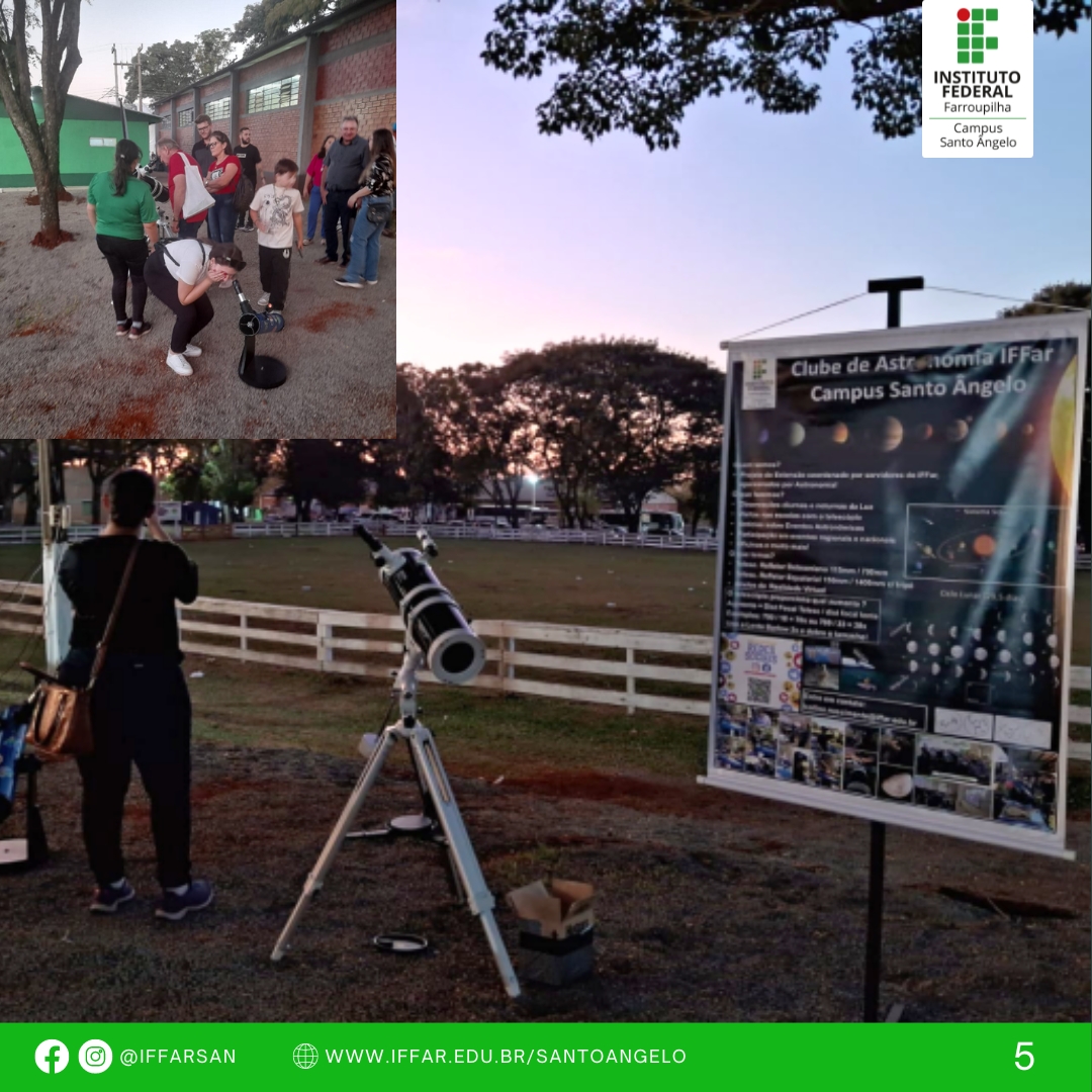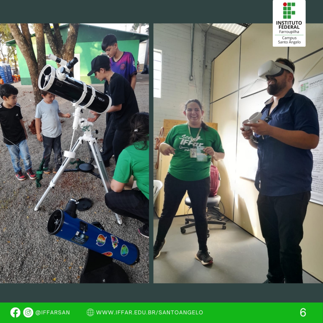 - Pavilhão da ciência e tecnologia, ações de recepção ao público e desenvolvimento de oficinas como: práticas de libras, computação desplugada, projeto de extensão clube de astronomia e laboratório IF Maker (observação da lua com telescópio, óculos de realidade virtual, caneta de impressão 3D), jogos de matemática com materiais concretos, entre outras;