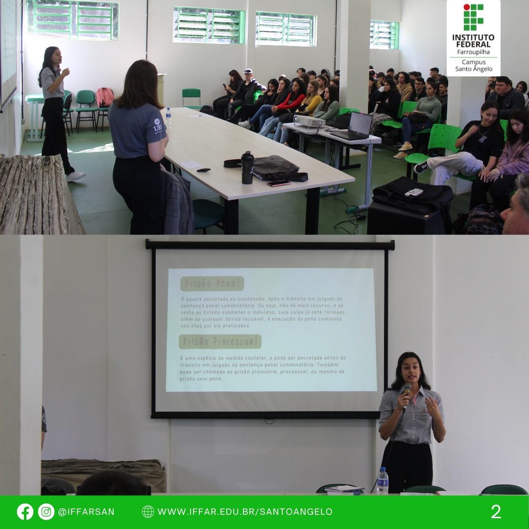 Na oportunidade foram apresentados aos alunos do terceiro ano dos Cursos Técnicos Integrados em Administração, Agricultura e Manutenção e Suporte em Informática questões relacionadas ao Direito penal Brasileiro.