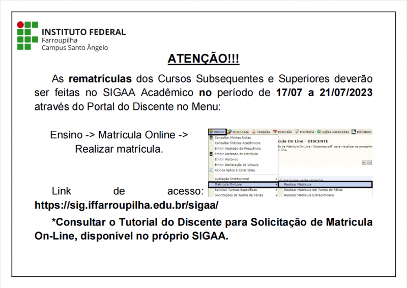 As rematrículas dos Cursos Subsequentes e Superiores deverão ser feitas no SIGAA Acadêmico no período de 17/07 a 21/07/2023 através do Portal do Discente no Menu: