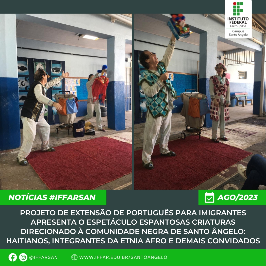 https://www.iffarroupilha.edu.br/noticias-san/item/32329-projeto-de-extens%C3%A3o-de-portugu%C3%AAs-para-imigrantes-apresenta-o-espet%C3%A1culo-espantosas-criaturas-direcionado-%C3%A0-comunidade-negra-de-santo-%C3%A2ngelo-haitianos,-integrantes-da-etnia-afro-e-demais-convidados#sigProId553d15483e