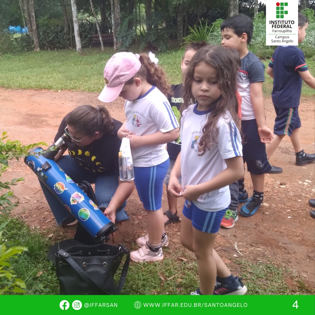 Por fim, os alunos puderam observar a lua no telescópio, fizeram piquenique e conheceram o Jardim do Mel, o meliponário do IFFar onde onde temos as abelhas sem ferrão “Jataí”, projeto coordenado pelo Técnico em Agropecuária Ivan J. Preuss, que falou sobre a importância do papel das abelhas para a natureza. O projeto também pode ser acompanhado no perfil @meliponario_iffarsan