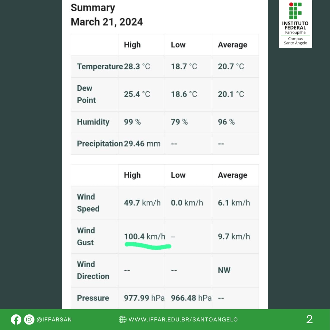 Estação meteorológica do IFFar Santo Ângelo marca rajada de 100,4 km/h.