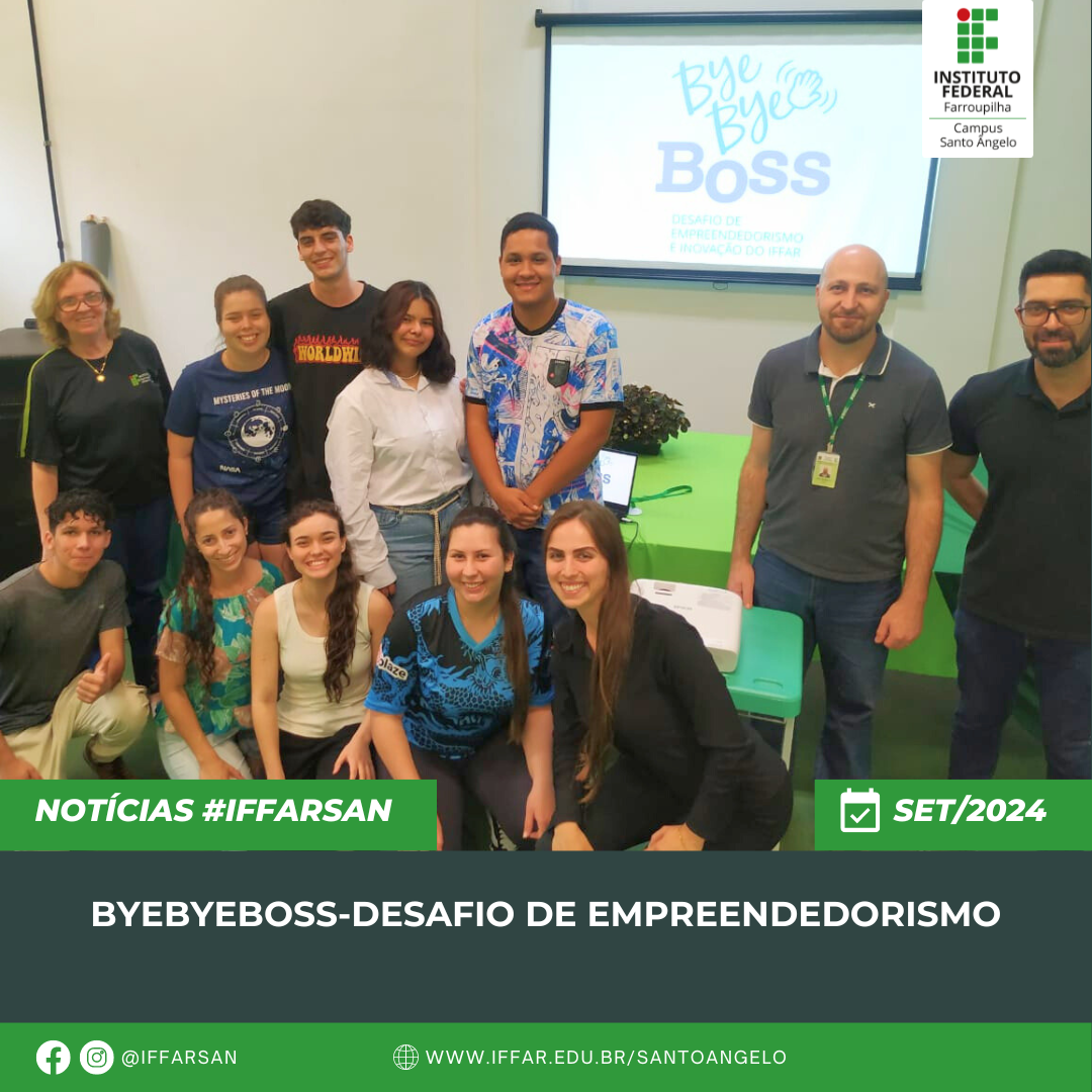 Bye Bye Boss - Desafio de Empreendedorismo e Inovação, tem como objetivo fomentar o empreendedorismo e a inovação no Instituto Federal Farroupilha. O desafio é realizado em todos os campi do IFFar que selecionam duas equipes para participar da final durante a 15ª Mostra da Educação Profissional e Tecnológica (XV MEPT) que será realizada no dia 03 de outubro no Campus de São Vicente do Sul.