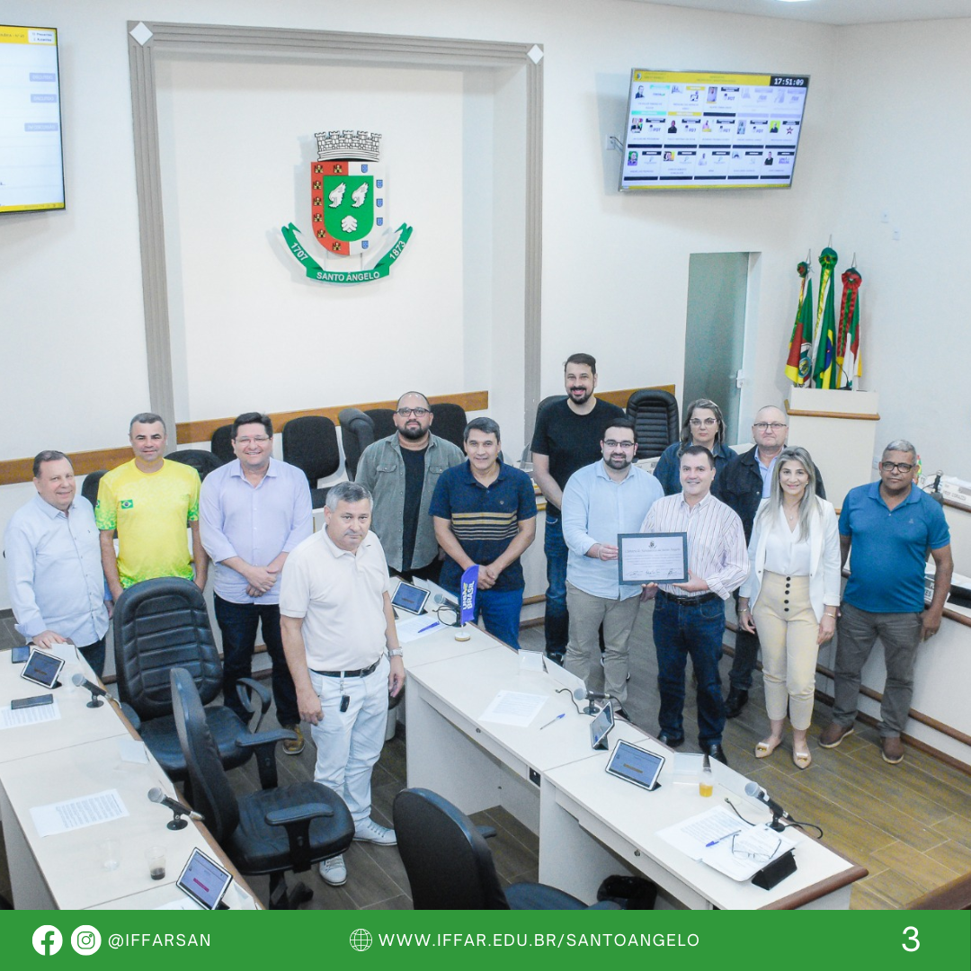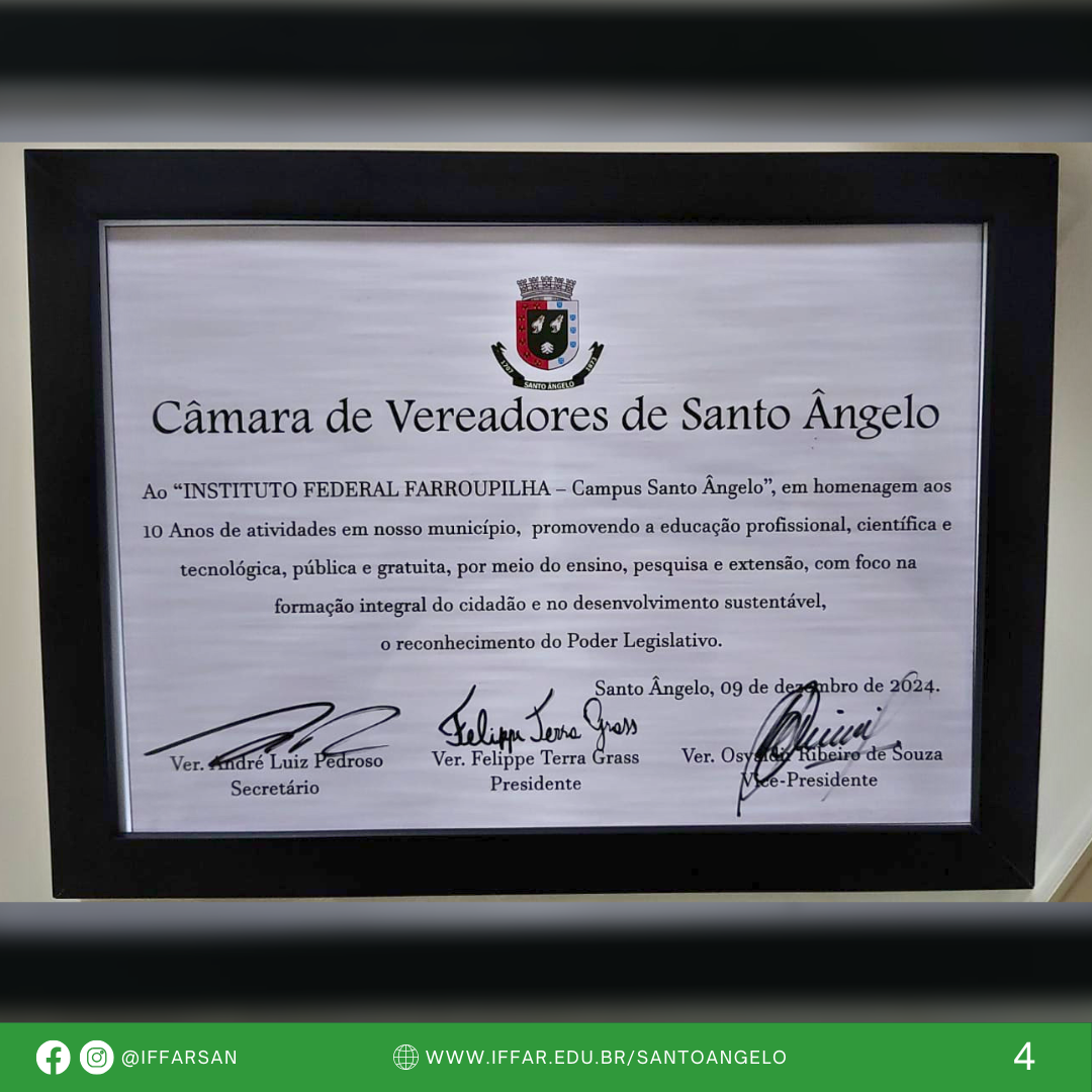 Na sessão ordinária da Câmara de Vereadores do dia 09 de dezembro de 2024 o Instituto Federal Farroupilha - Campus Santo Ângelo (IFFar-SAn), recebeu homenagem de reconhecimento aos 10 (dez) anos de atuação junto à comunidade local e regional, promovendo a educação profissional, científica e tecnológica, pública e gratuita, por meio do ensino, pesquisa e extensão, com foco na formação integral do cidadão e no desenvolvimento sustentável.