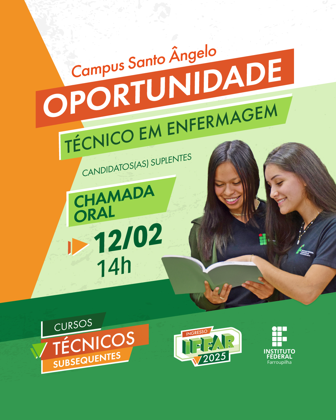 Na próxima quarta-feira, dia 12/02, o Campus Santo Ângelo realizará a Chamada Oral de candidatos suplentes para o preenchimento de vagas remanescentes do Curso Técnico em Enfermagem Subsequente, para o início do ano letivo de 2025.