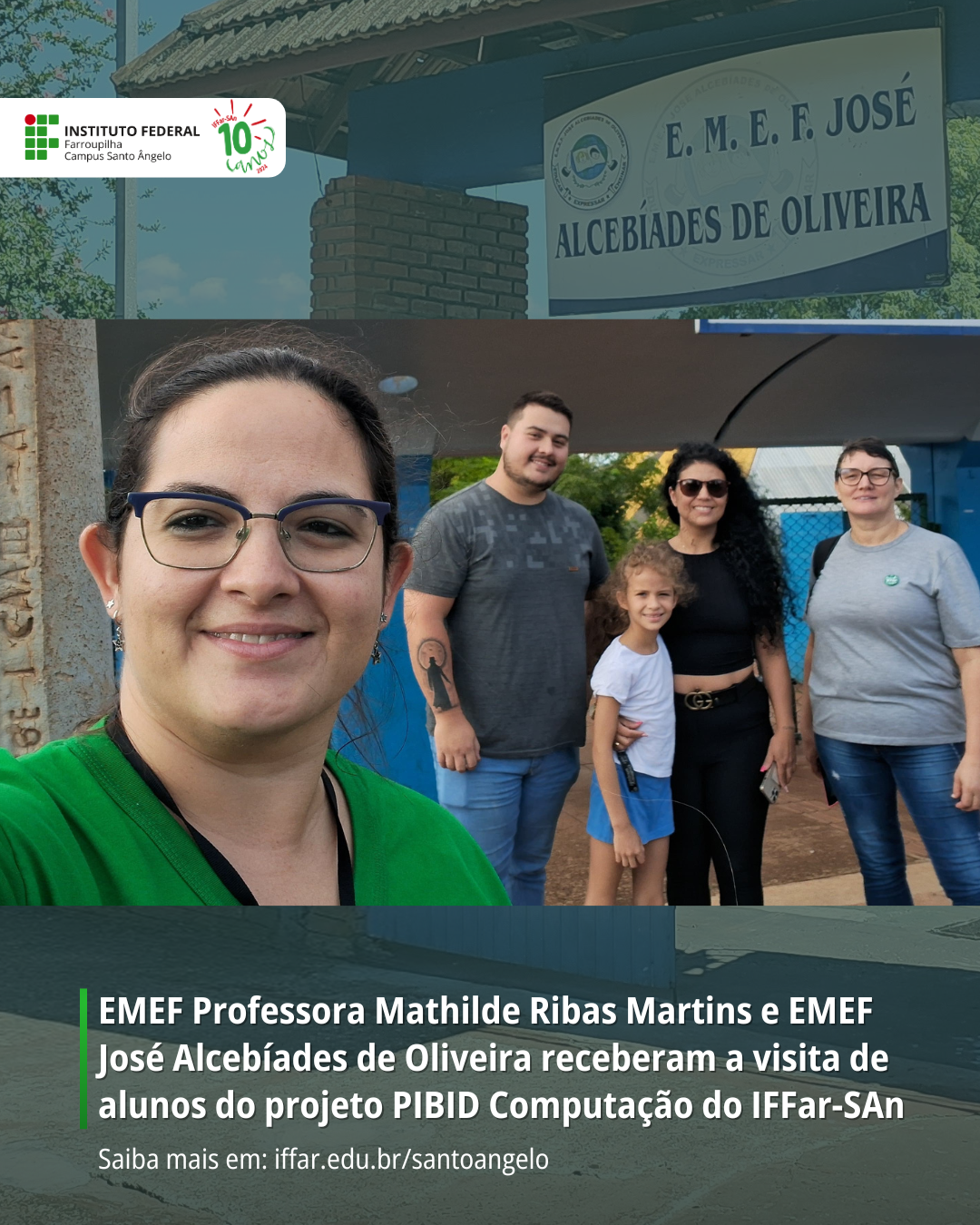 No dia 17 de fevereiro, as escolas municipais EMEF Professora Mathilde Ribas Martins e EMEF José Alcebíades de Oliveira receberam a visita de parte da equipe do projeto PIBID Computação do IFFar - Campus Santo Ângelo. Pela manhã, a professora Karlise Soares Nascimento, acompanhada das acadêmicas Kelen Aline Ribeiro da Silva e Olga Pedrolina Oliveira Leite, além do acadêmico Lucas Paz Klering, esteve na escola Mathilde Ribas Martins. Já no período da tarde, junto com os acadêmicos Leonardo Carvalho Velaski, Marcelo da Silva Torres e Samuel Müller Forrati realizaram a visita à escola José Alcebíades de Oliveira.