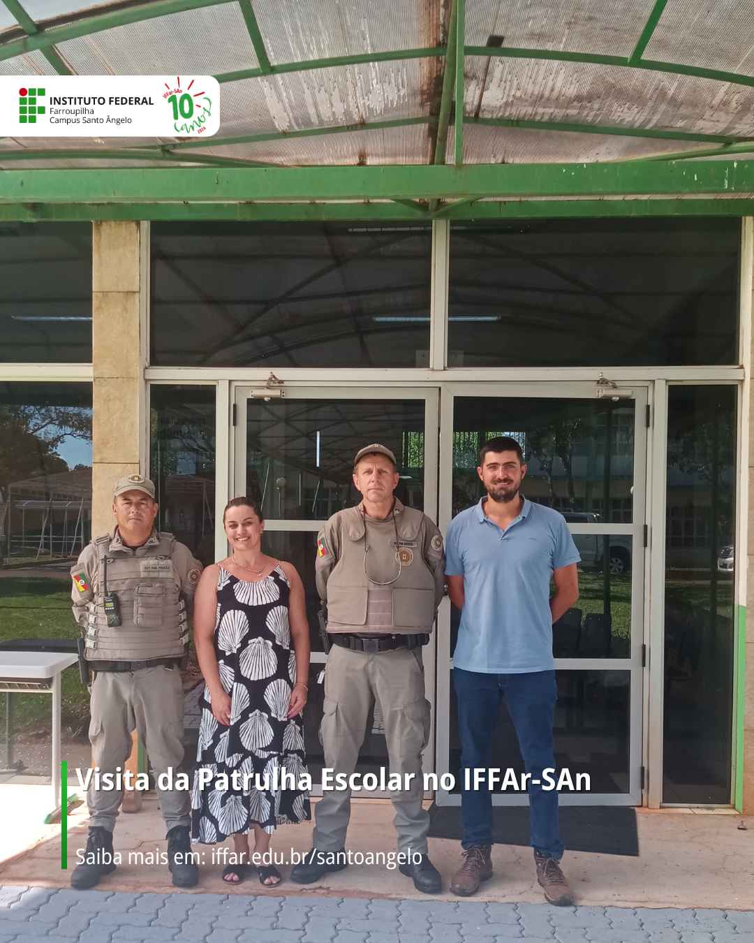 No dia 11 de fevereiro de 2025, o Instituto Federal Farroupilha - Campus Santo Ângelo (IFFar-San) recebeu a visita da Patrulha Escolar do 7º RP Mon, representada pelo Sargento Pedrão e pelo Sargento Marcos.