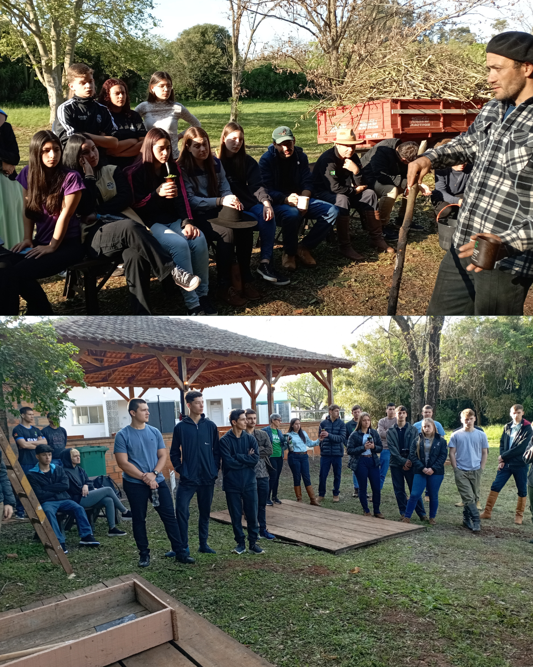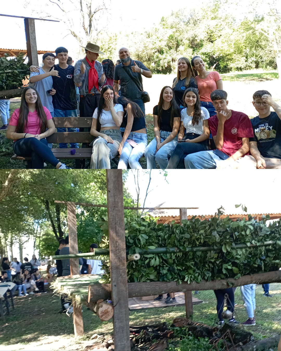 O processo de produção de erva-mate se estendeu ao longo dos dois dias, envolvendo alunos do campus e visitantes, desde a colheita da planta, o sapeco, a formação dos macacos, a secagem no carijo, o cancheamento e, por fim, a pilagem da erva e o sorver do chimarrão com a erva-mate produzida. Esses momentos são vivenciados com muita alegria por parte dos alunos, em especial dos cursos técnicos integrados.