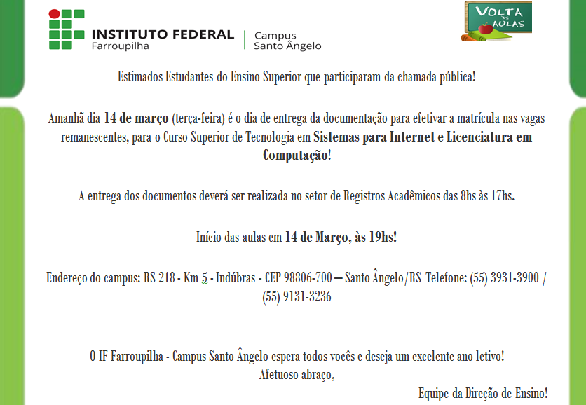 Campus Santo Ângelo convida estudantes do Ensino Superior que participaram da chamada pública para início das aulas