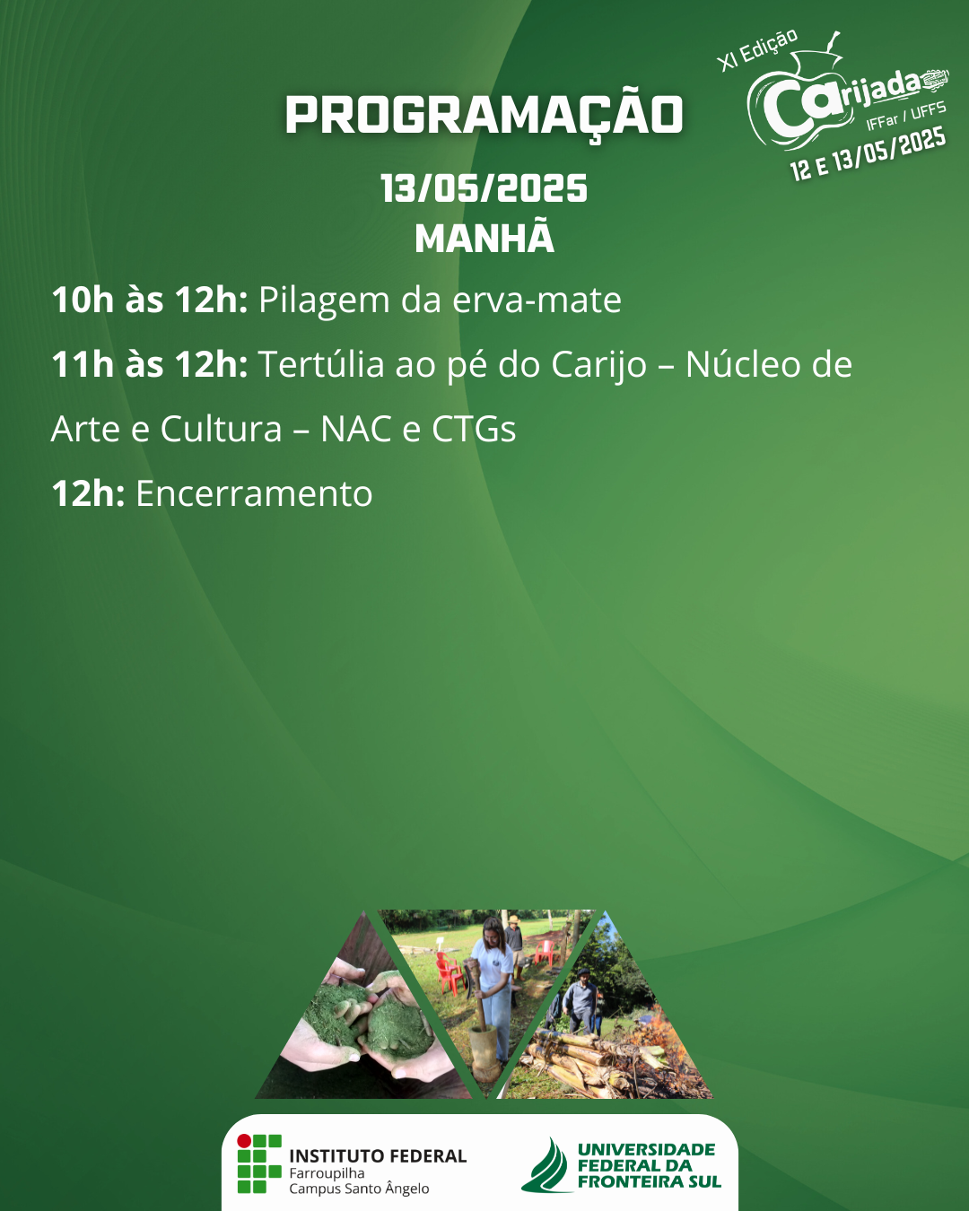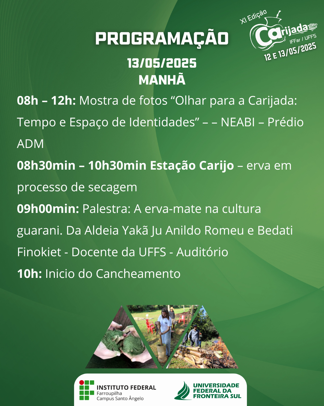 Entre os dias 12 e 13 de maio de 2025 estará acontecendo, nas dependências do Instituto Federal Farroupilha Campus de Santo Ângelo, mais uma carijada. Através de uma ação de extensão, em parceria com a UFFS Campus de Cerro Largo, buscamos reviver a prática ancestral de produção artesanal de erva-mate pelo método de carijo.