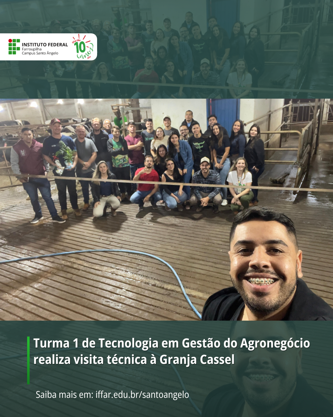 No dia 14 de maio de 2025, os estudantes do 1º ano do curso de Tecnologia em Gestão do Agronegócio do IFFar – Campus Santo Ângelo participaram de uma visita técnica à Granja Cassel, localizada no distrito de Atafona, interior de Santo Ângelo (RS). A atividade foi organizada dentro da disciplina de Fundamentos da Produção Animal.