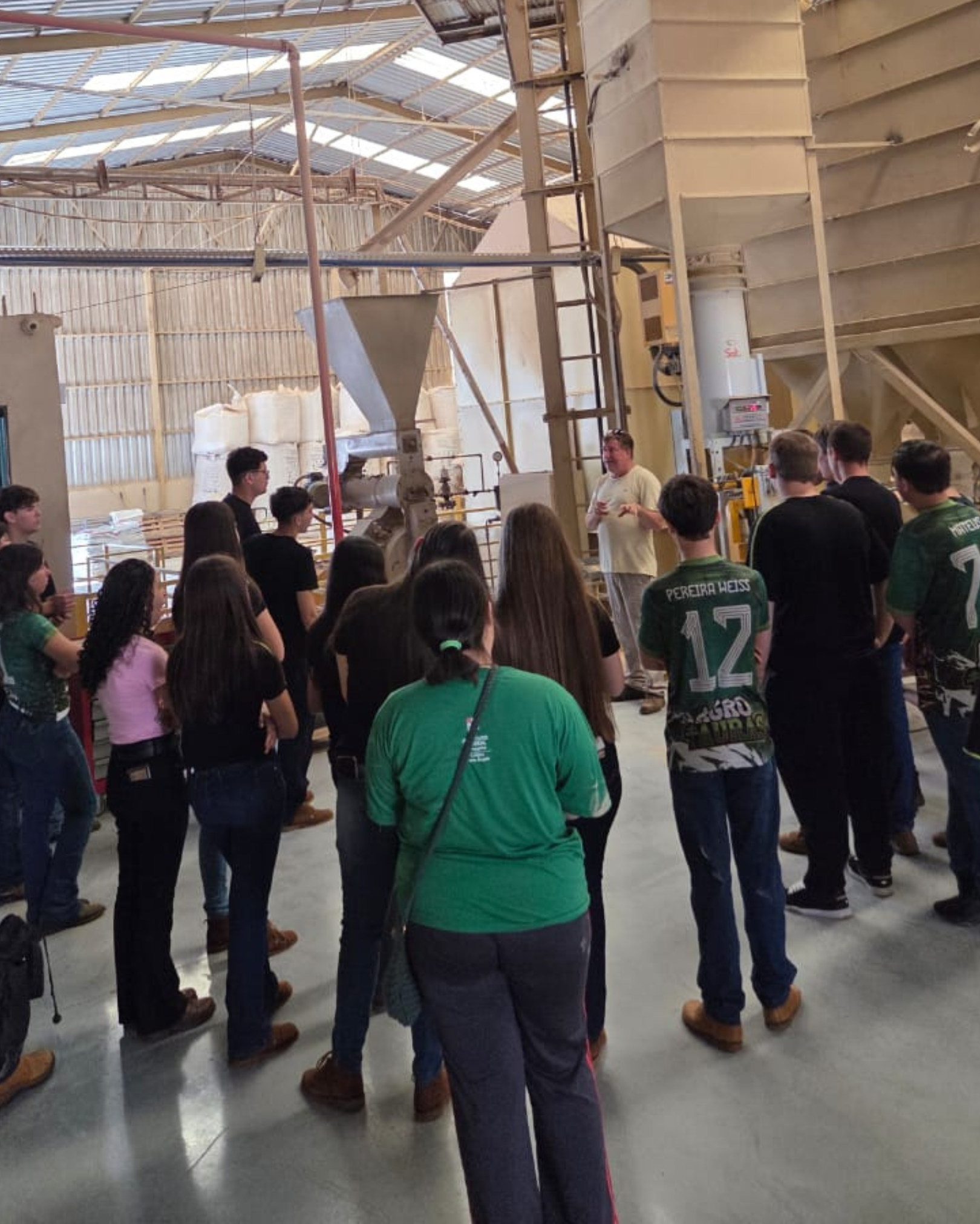 Durante a visita, os alunos conheceram o funcionamento da empresa, desde o recebimento dos ingredientes até a produção das rações, e também discutiram a importância das etapas de análise e controle de qualidade para garantir a segurança e o valor nutricional dos produtos.