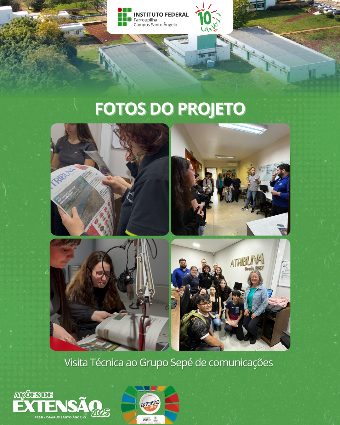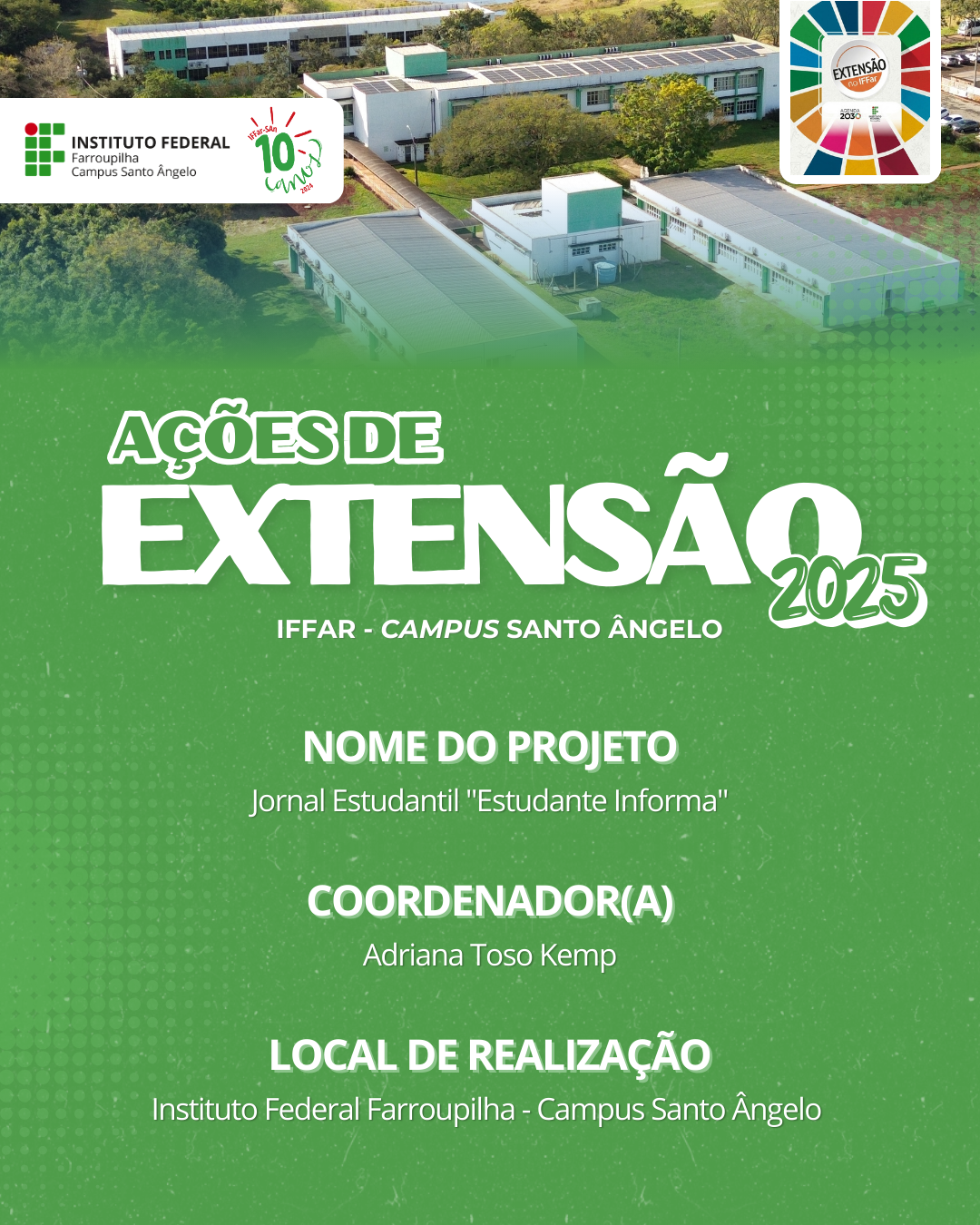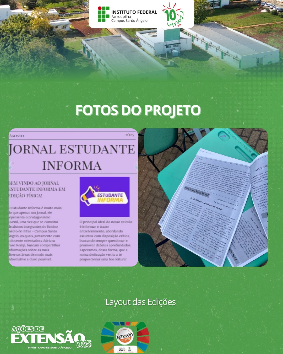 Desde 2022, o projeto Jornal Estudantil é desenvolvido no IFFar – Campus Santo Ângelo, com foco na criação e difusão de um Informativo Digital produzido por estudantes interessados em comunicação, escrita e prática jornalística.