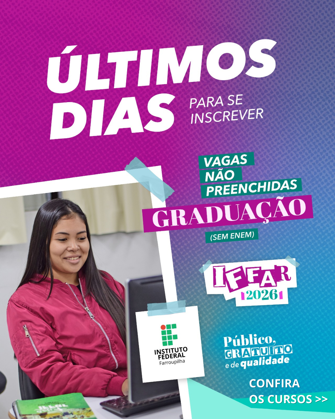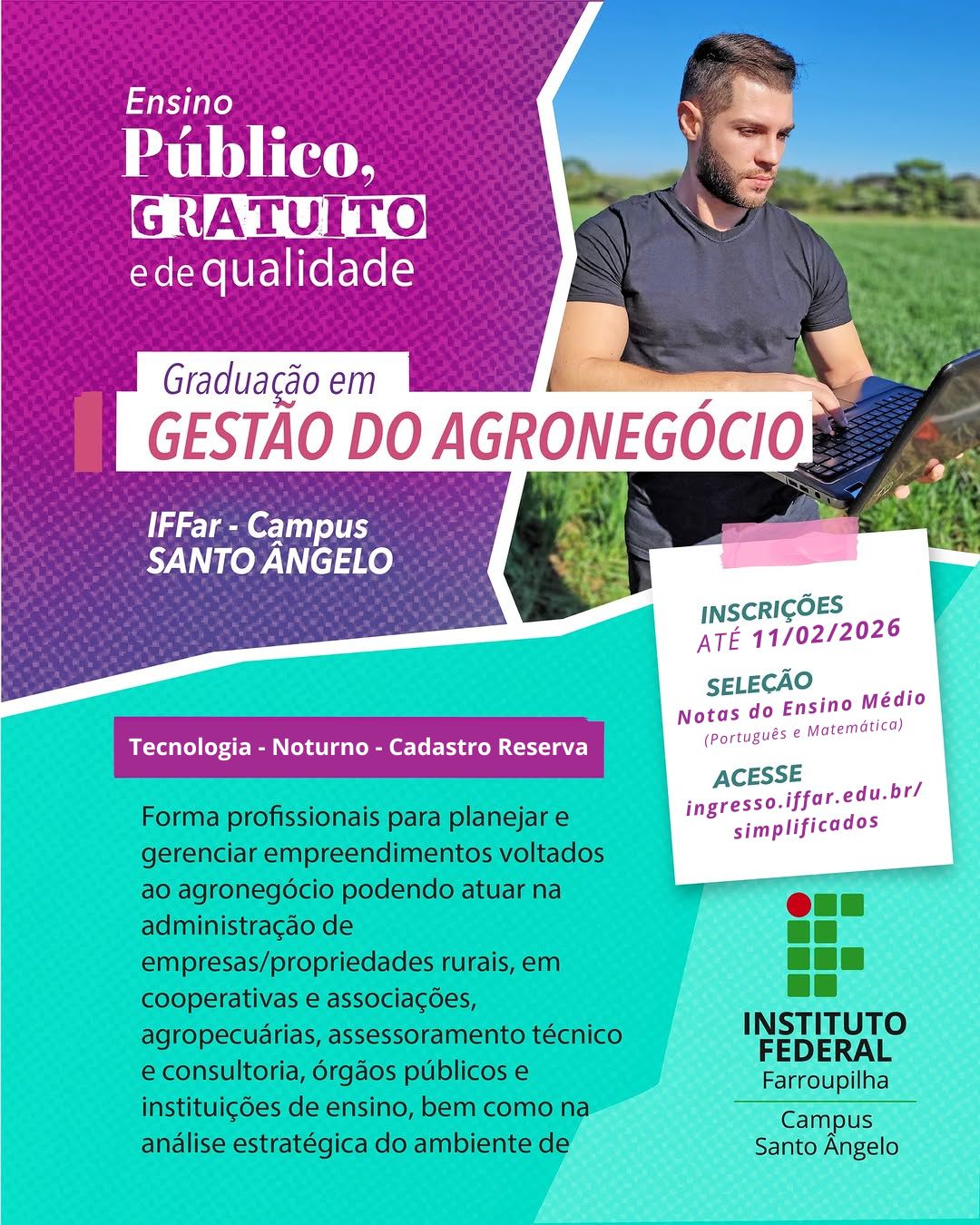 As inscrições para o Processo Seletivo Simplificado 2026 dos Cursos de Graduação do IFFar terminam nesta quarta-feira, 11 de fevereiro.