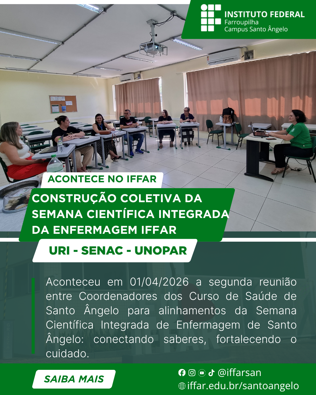No dia 1º de abril de 2026, foi realizada a segunda reunião entre os coordenadores dos cursos da área da saúde de Santo Ângelo, com foco na organização da Semana Científica Integrada de Enfermagem: conectando saberes, fortalecendo o cuidado.