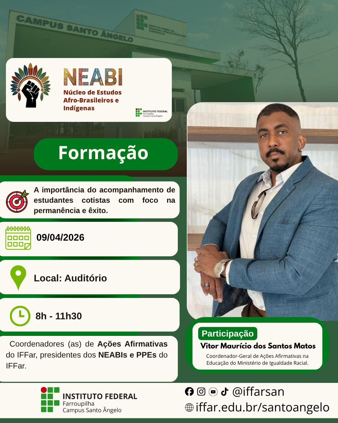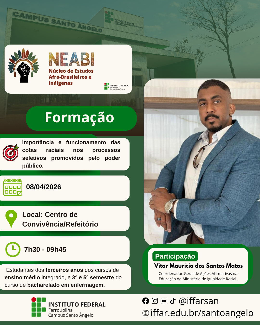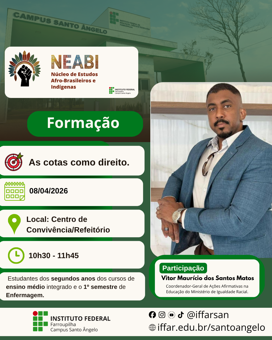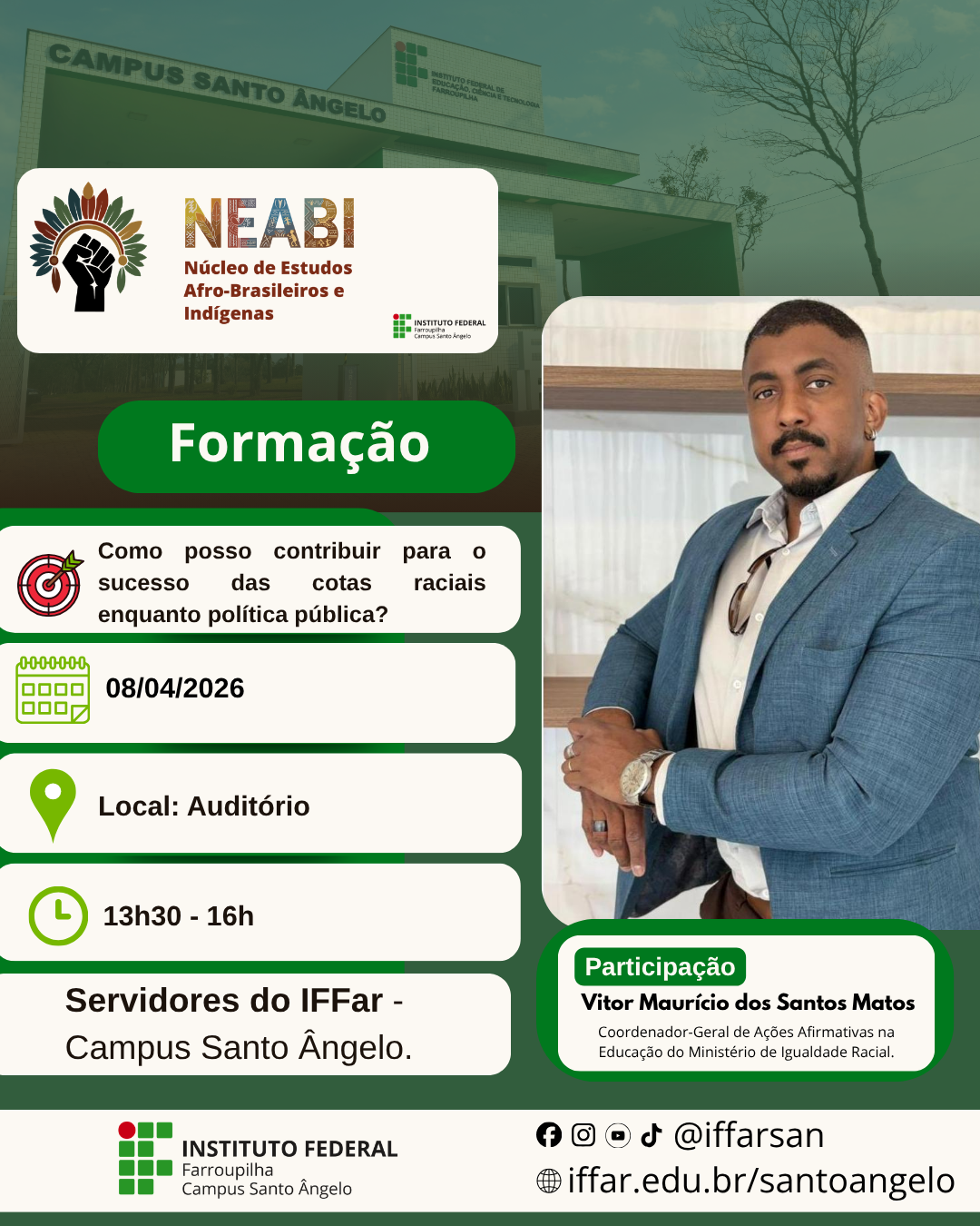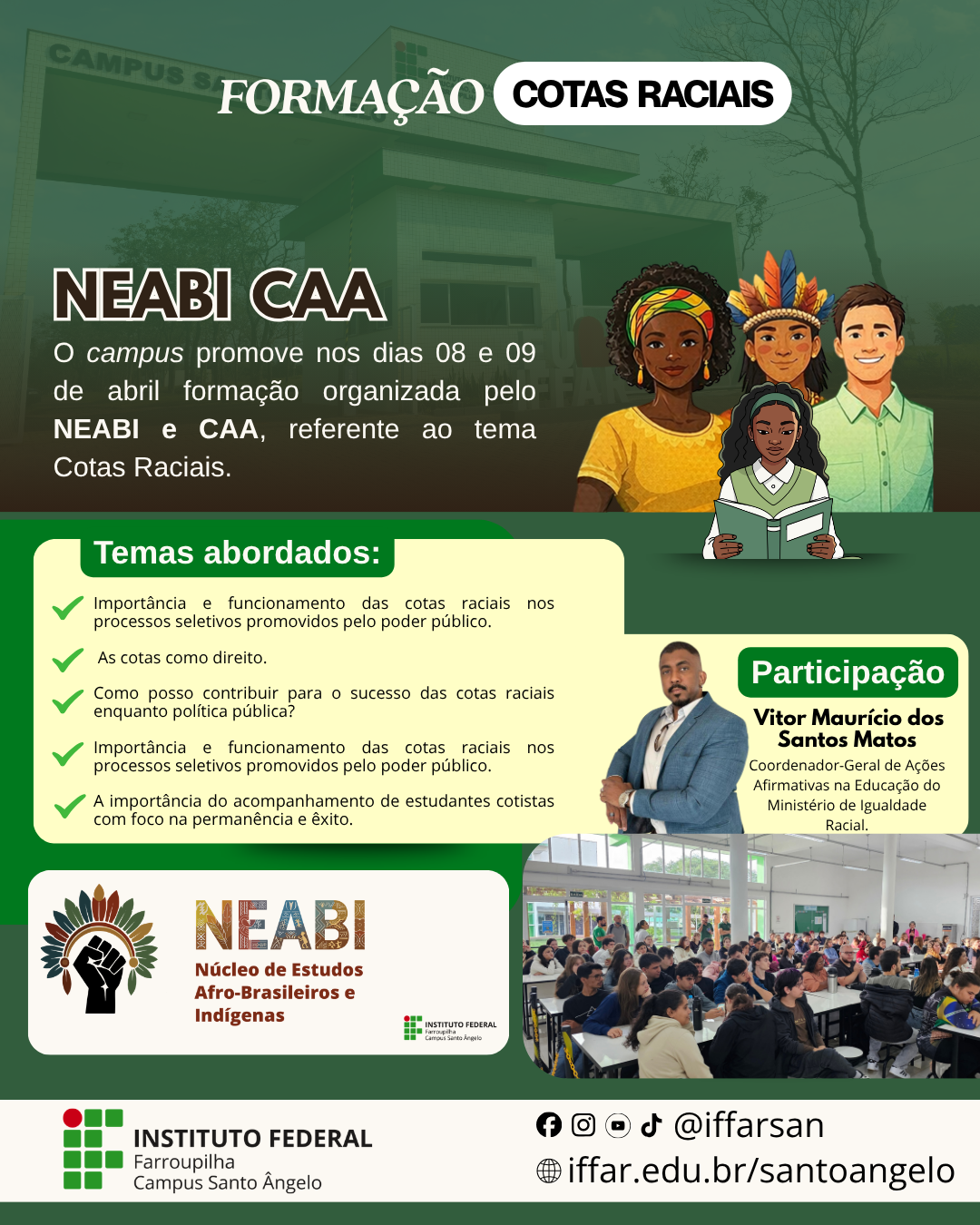 O Instituto Federal Farroupilha – campus Santo Ângelo (IFFar-SAn), por meio do Núcleo de Estudos Afro-Brasileiros e Indígenas (NEABI) e da Coordenação de Ações Afirmativas (CAA), promove nos dias 08 e 09 de abril de 2026 uma formação sobre Cotas Raciais.