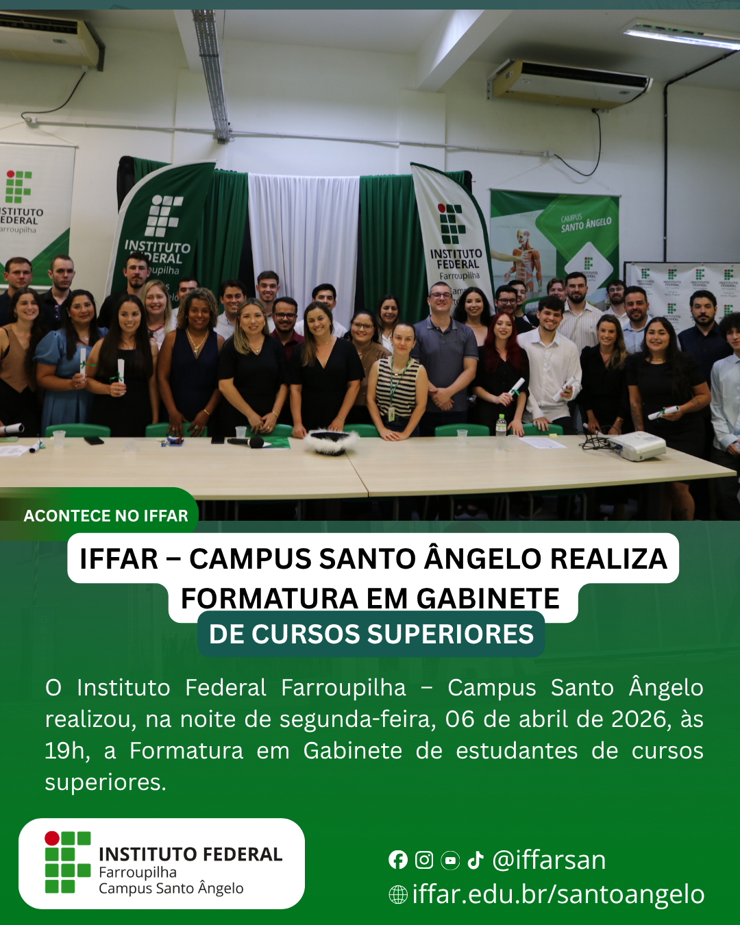 O Instituto Federal Farroupilha – campus Santo Ângelo (IFFar-SAn) realizou, na noite de segunda-feira, 06 de abril de 2026, às 19h, a Formatura em Gabinete de estudantes de cursos superiores.
