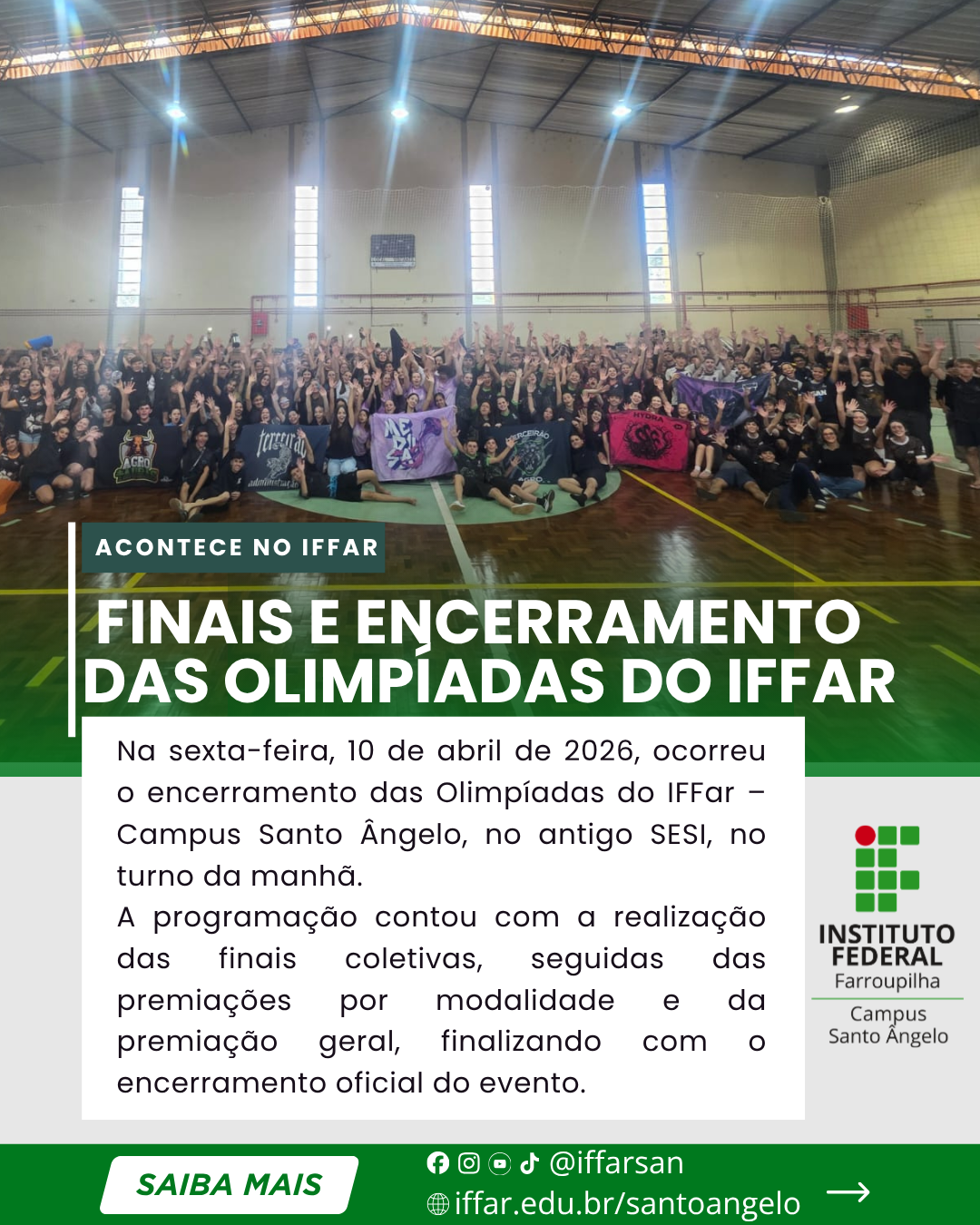 Na sexta-feira, 10 de abril de 2026, ocorreu o encerramento das Olimpíadas do IFFar – campus Santo Ângelo (IFFar-SAn), no antigo SESI, no turno da manhã.