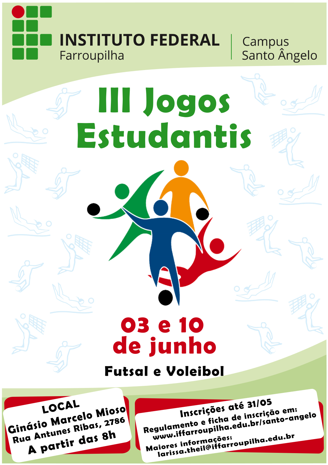 O Instituto Federal Farroupilha - Campus Santo Ângelo convida alunos, servidores e comunidade para participar do "III JOGOS ESTUDANTIS" que será realizado nos dias 03 e 10 de junho, a partir das 8h, no ginásio Marcelo Mioso.