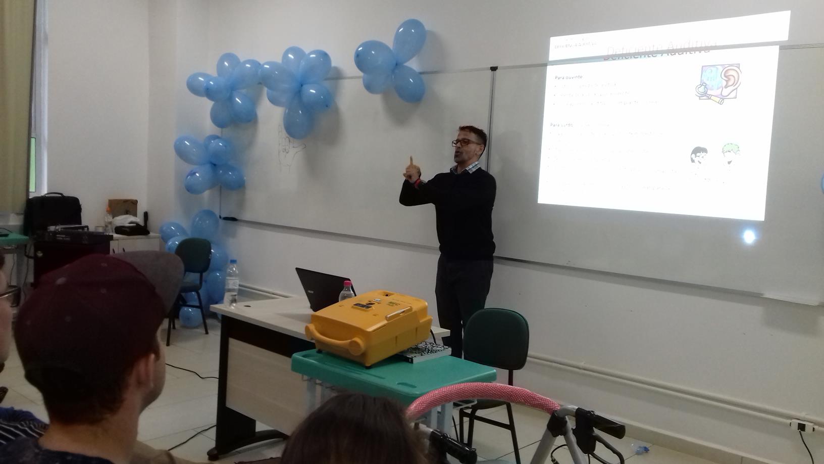 O Núcleo de Apoio as Pessoas com Necessidades Educacionais Especiais - NAPNE, juntamente com a Coordenação de Ações Inclusivas - CAI, Direção Geral, Direção de Ensino, Direção de Administração, Coordenação Geral de Ensino, Setor de Apoio Pedagógico e demais servidores promoveram uma palestra no dia 29 de Setembro com o Professor Dr. Cláudio Henrique Nunes Mourão (UFRGS), tendo como tema Identidade e Cultura Surda: Reflexos no Contexto Educacional de Surdos, em que participaram alunos, servidores e a comunidade externa.