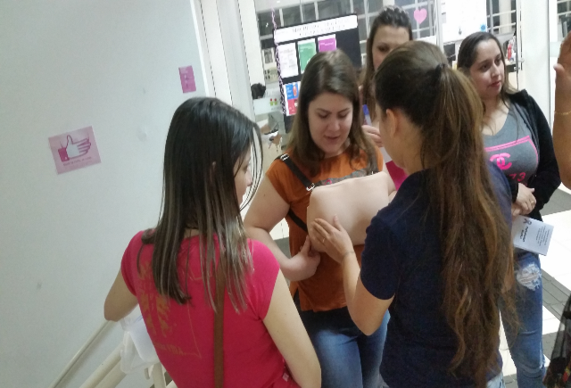 No dia 17 de outubro, outro grupo de alunas desenvolveu um folder contendo informações relativas ao câncer de mama e o autoexame, além do câncer de colo uterino. Esse material foi distribuído no intervalo das aulas, juntamente com o laço rosa, que representa a campanha Outubro Rosa. Ainda, as alunas utilizaram o modelo anatômico de mamas para demonstrar como o autoexame das mamas deve ser realizado e quais alterações devem ser identificadas durante esse exame.