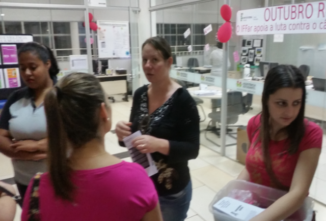 Por fim, dia 24 de outubro, o grupo responsável pela atividade, propôs aos alunos do campus, no intervalo da aula, que deixassem sua marca (mão pintada de rosa) no cartaz alusivo a Campanha Outubro Rosa. Além disso, distribuíram folder criado por elas, com informações relativas ao câncer de mama e de colo uterino. Também, foram construídas placas com dizeres de incentivo ao exame preventivo para que os voluntários pudessem registrar momento com fotografia.
