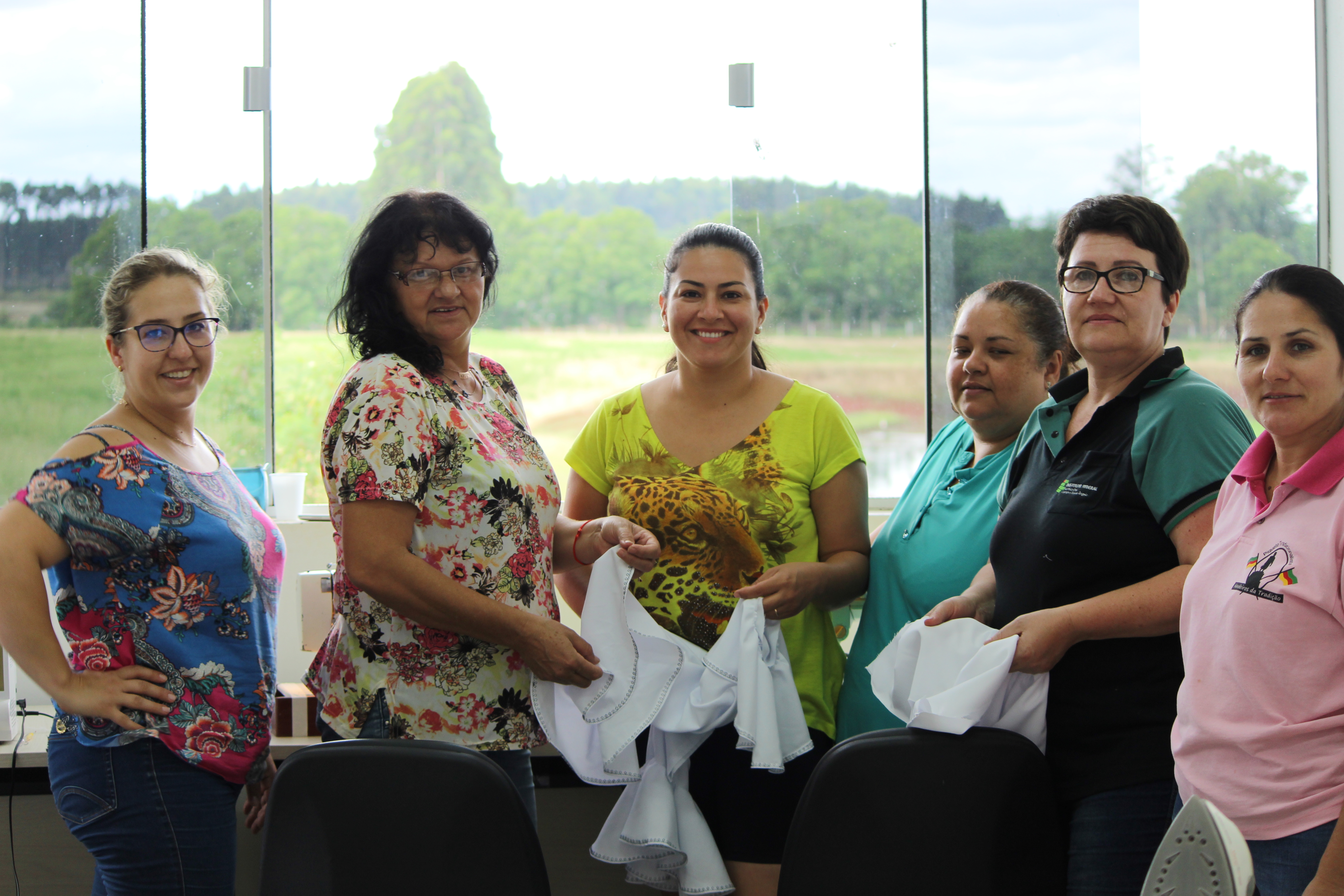 Acompanharam os alunos: o Diretor de Pesquisa, Extensão e Produção, Adilson Stamberg, as docentes Nelcí, Sônia e Letícia e duas costureiras sorteadas, que participaram do curso de corte e costura.