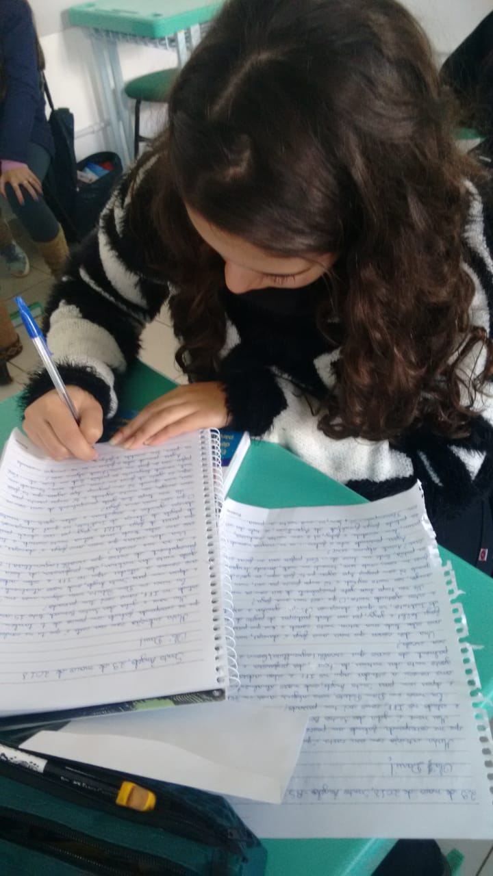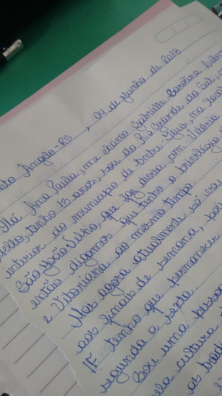 Neste mês de junho, a professora está trabalhando o gênero Carta pessoal. Os alunos, após o estudo da estrutura e função comunicativa desse gênero, produzirão suas cartas e as encaminharão para os endereços de jovens do IFPA, campus Tucuruí e IFMT, Campus Alta Vista. A proposta está gerando um intenso debate, engajamento e alegria nos processos de escrita.
