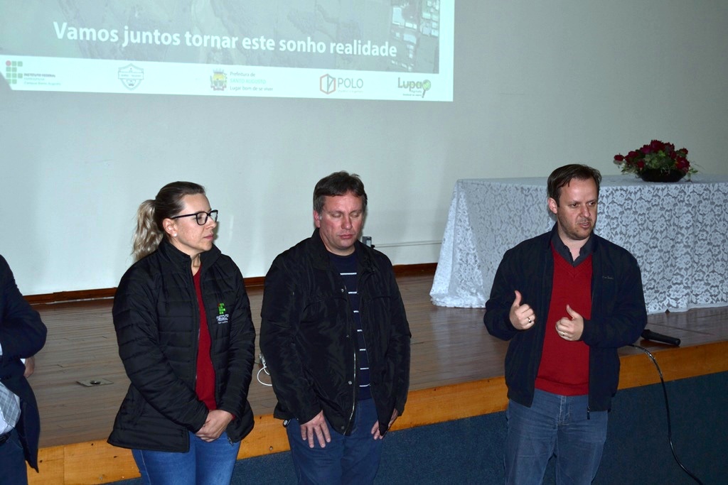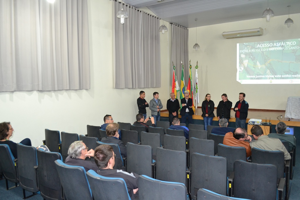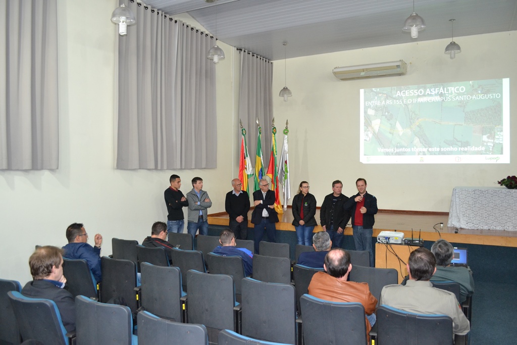 Verlaine explicou aos presentes, que a obra beneficiará os estudantes de todas as cidades que utilizam o acesso secundário para chegar ao Campus Santo Augusto, no entanto demandará um grande investimento, que poderá custar mais de 5 milhões de reais. Na sequência, Otávio Polo apresentou o traçado do acesso asfáltico e as partes do projeto que já estão concluídas. O prefeito Naldo Wiegert, afirmou que o executivo apoiará totalmente o projeto, mas no momento não dispõe de recursos para custear a obra, sendo importante ter o projeto pronto, o mais breve possível, para que seja enviado ao Departamento de Estradas e Rodagens – DAER para aprovação.