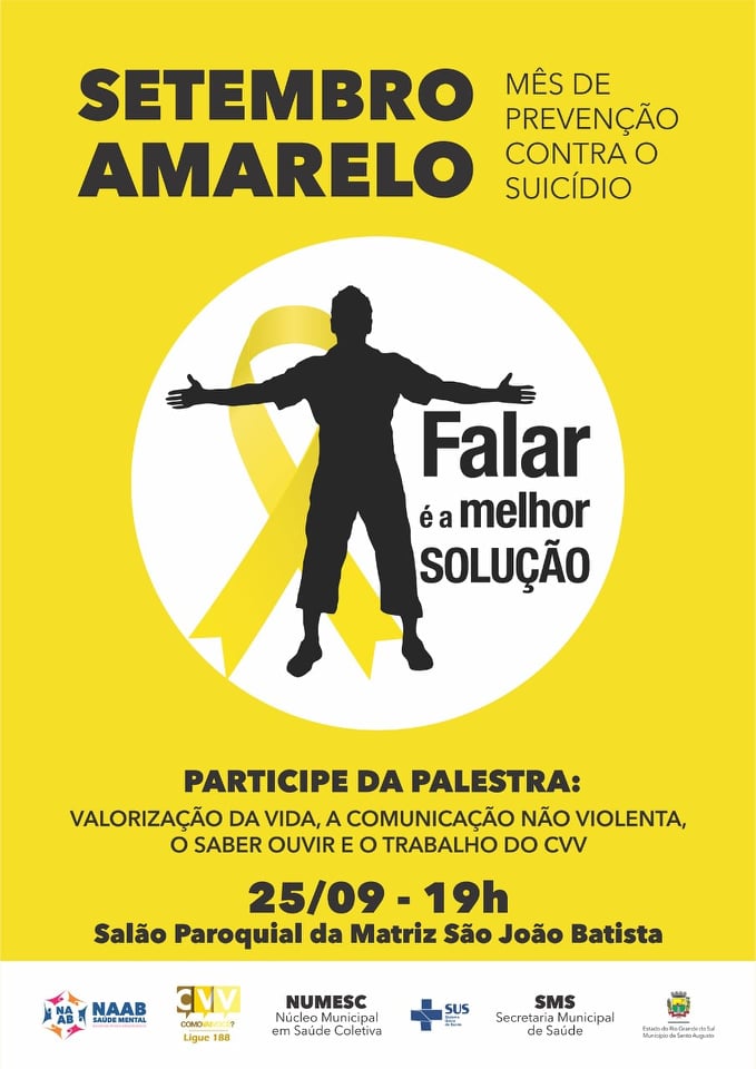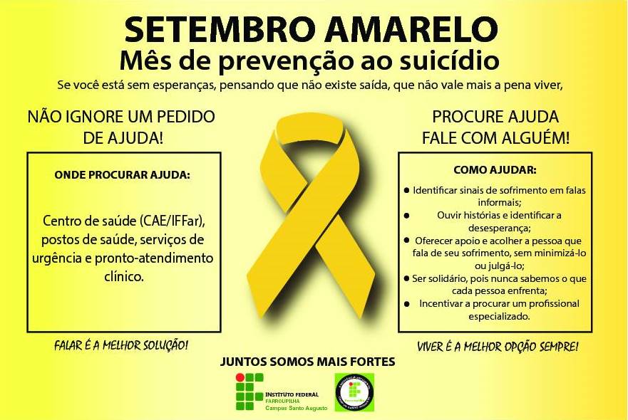 A Coordenação de Assistência Estudantil – CAE do IFFar – Campus Santo Augusto está desenvolvendo durante esse mês, ações alusivas ao “Setembro Amarelo”, campanha de conscientização sobre a prevenção do suicídio, que ocorre mundialmente, desde 2015. A campanha teve o lançamento oficial no IFFar na tarde de ontem com a palestra transmitida pela webtv, “A saúde mental dos estudantes: o que eu tenho com isso?”.