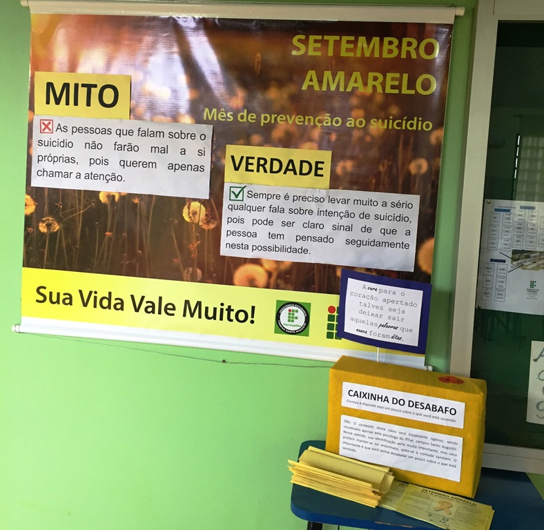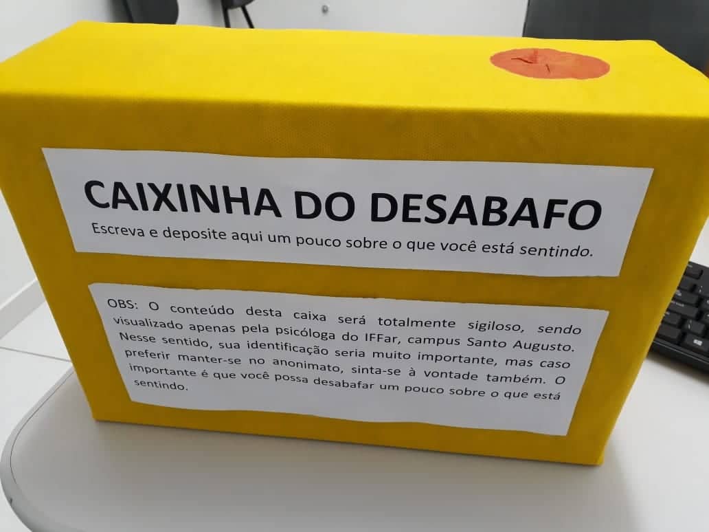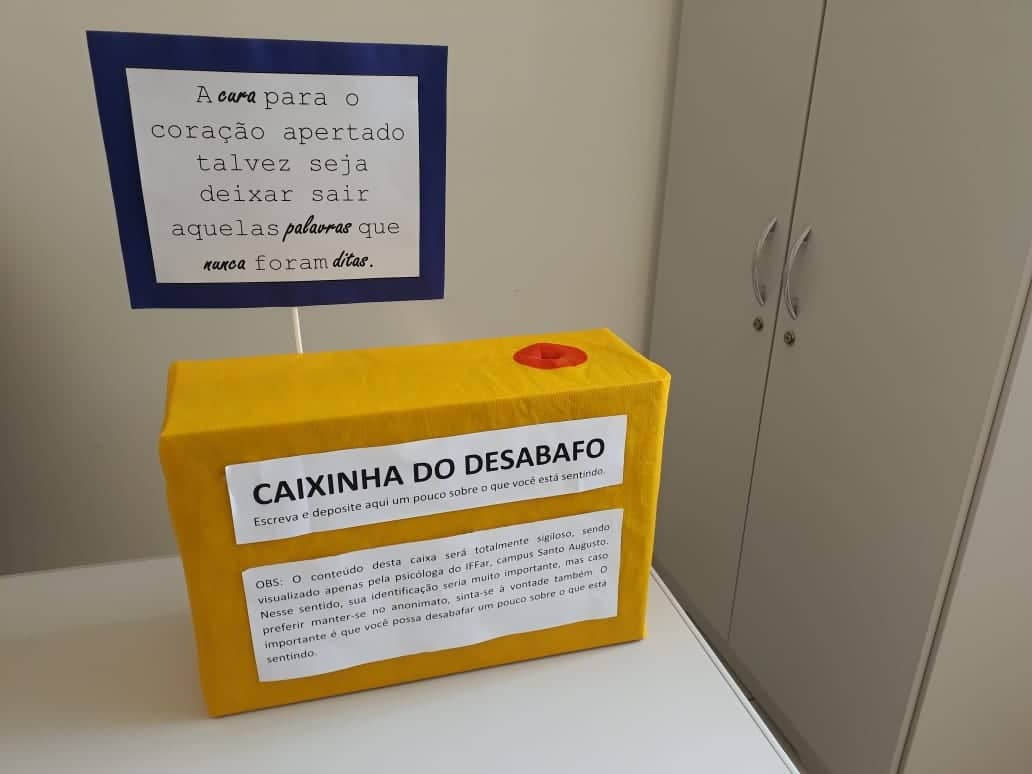 Também foi criada a “Caixinha do Desabafo”, disponibilizada junto ao banner, com o objetivo de oferecer mais um espaço para que os alunos possam estar falando de seus sentimentos. A caixa será aberta somente ao final do mês, pela psicóloga do campus, e seu conteúdo será totalmente sigiloso.