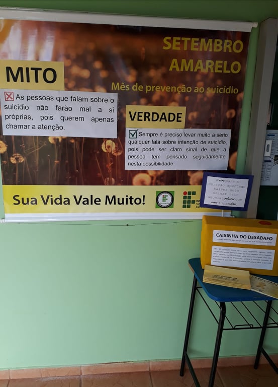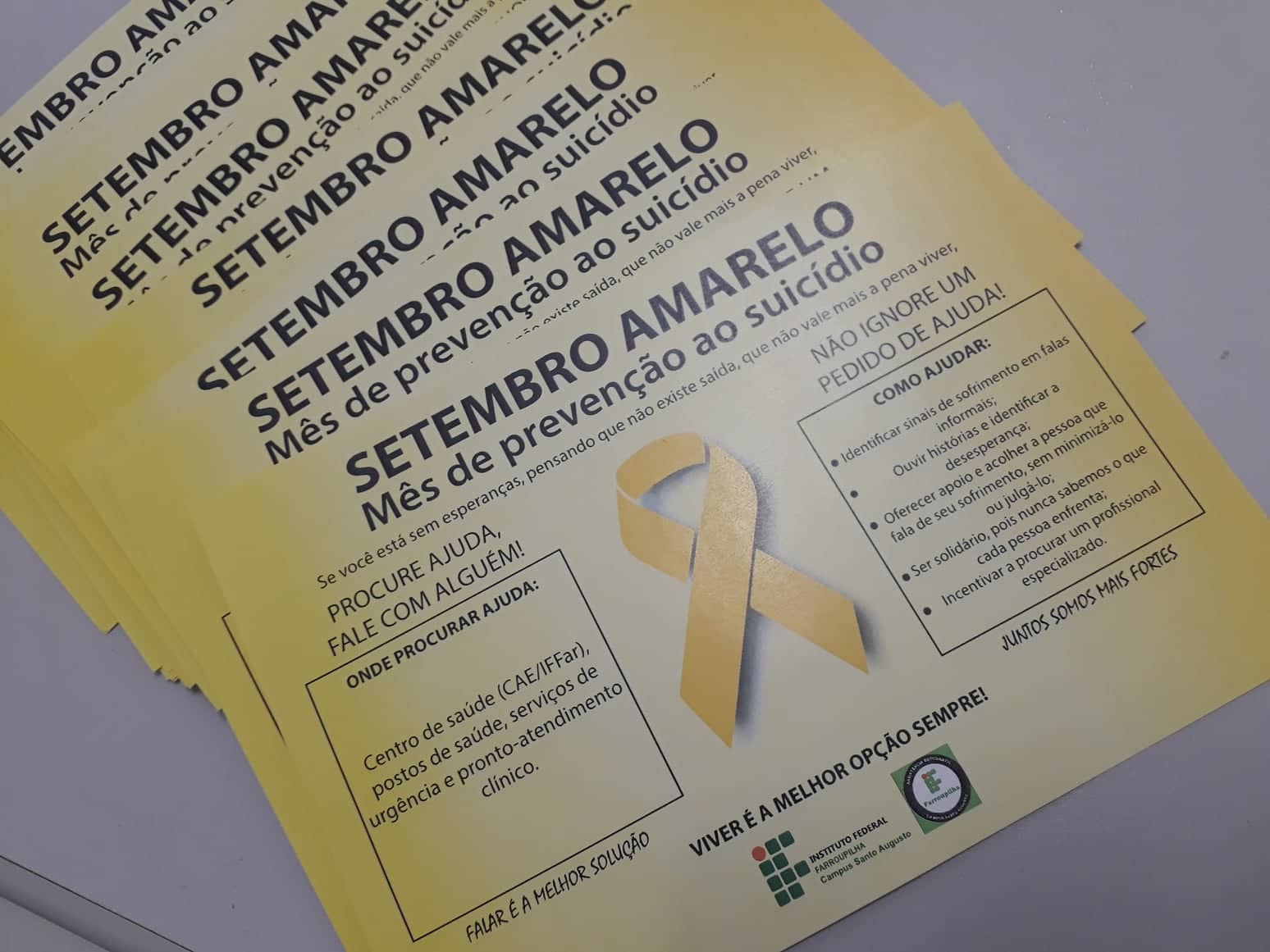 A equipe da Assistência Estudantil também realizou, no dia 10 de setembro, dia Mundial de Prevenção ao Suicídio, conversa com os líderes das turmas dos cursos técnicos integrados ao Ensino Médio, falando sobre a importância da campanha do Setembro Amarelo, sobre a necessidade de ficarem atentos a essa questão em sala de aula, e, incentivando a divulgação de informações nas redes sociais. Nesse dia também foram entregues folders informativos aos alunos.
