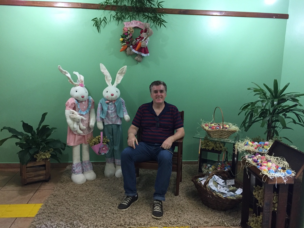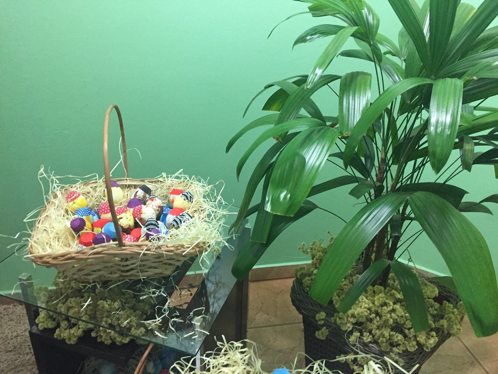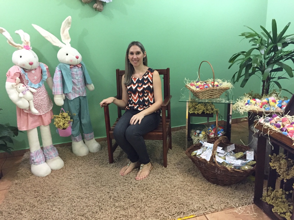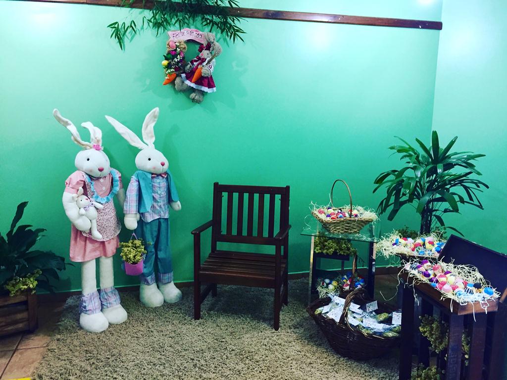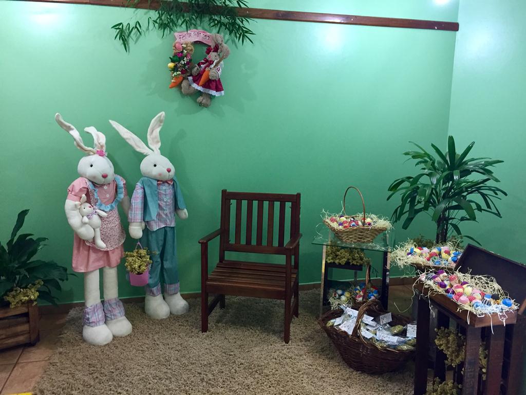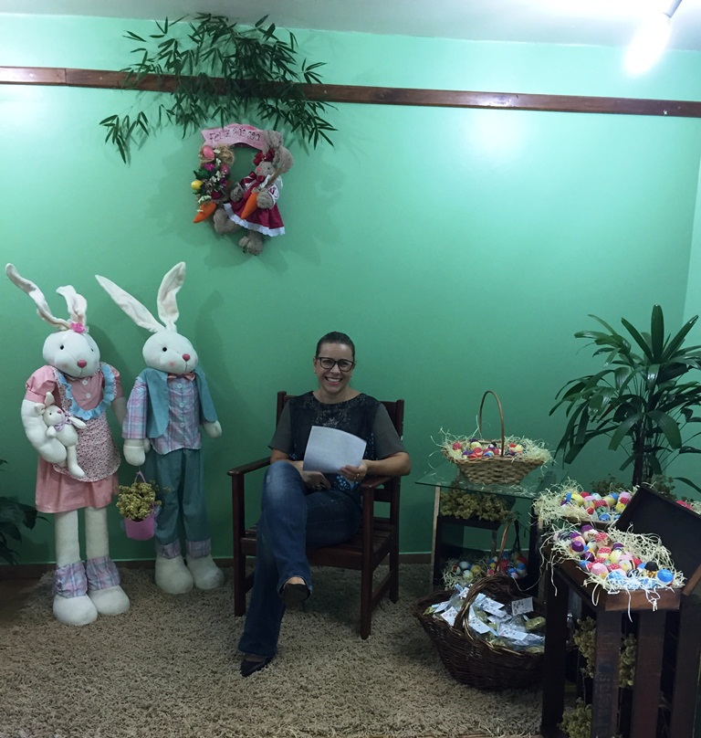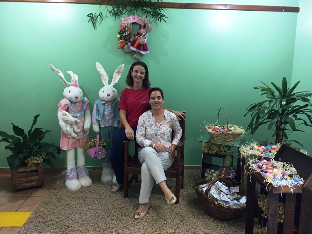 Para receber os servidores e também marcar o período de Páscoa, a Direção de Ensino montou no hall de entrada do auditório um ambiente decorado com ovos coloridos, coelhos de pelúcia e uma cesta com lembrancinhas.