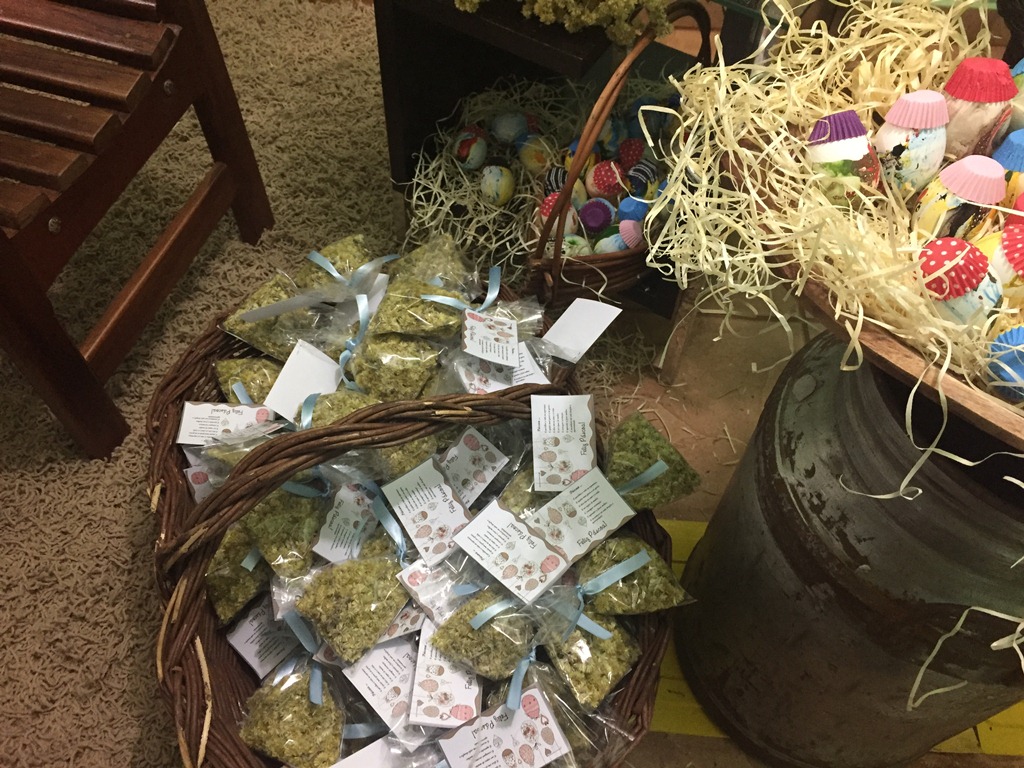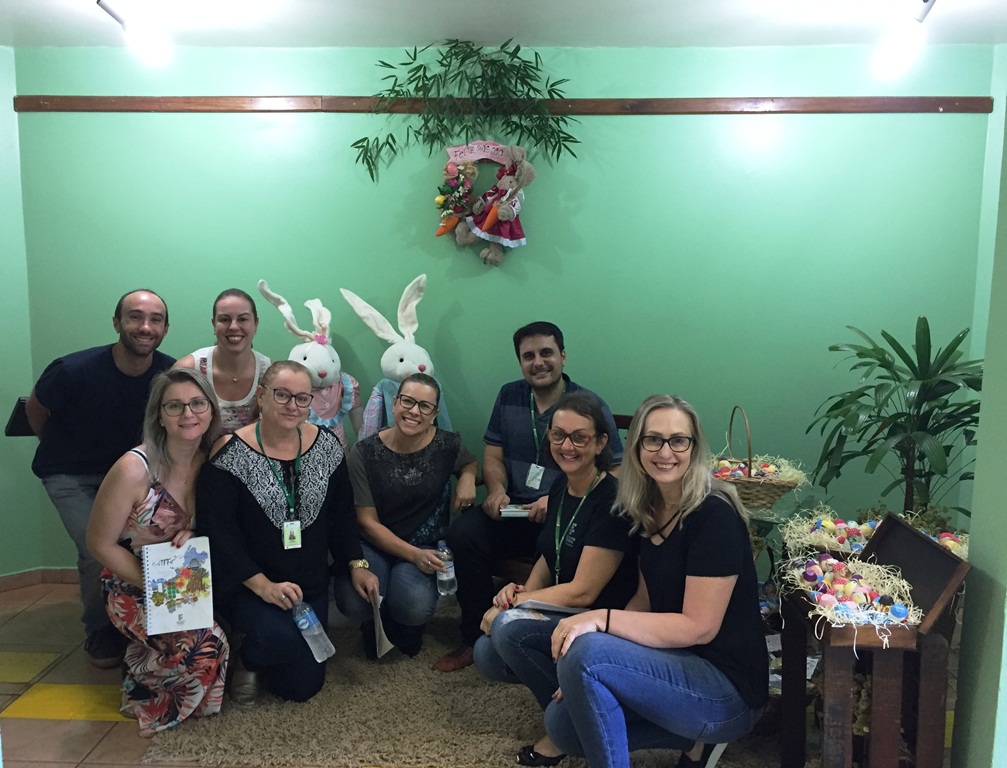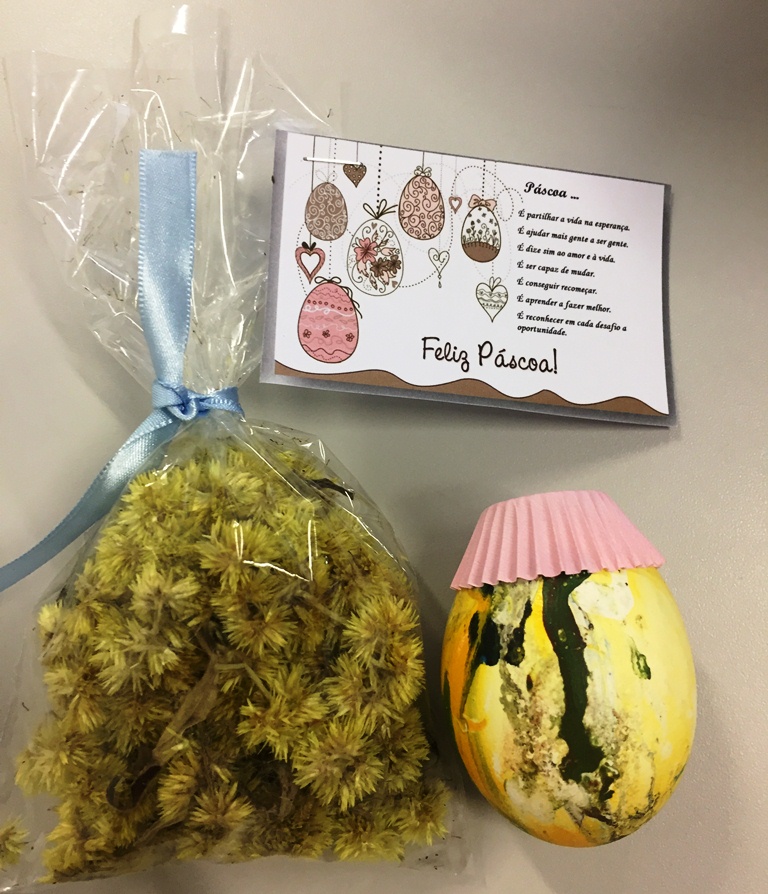 Ao final da reunião, a equipe diretiva desejou aos servidores uma feliz e abençoada Páscoa e todos puderam pegar na saída, junto à decoração, a sua lembrancinha, composta por um saquinho de chá de marcela, produzido na instituição, e uma casquinha de ovo decorada.