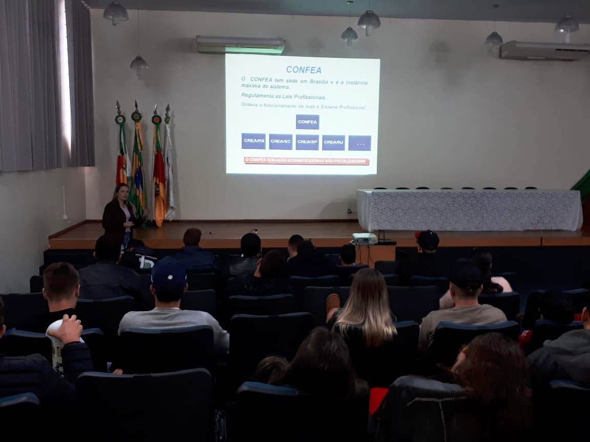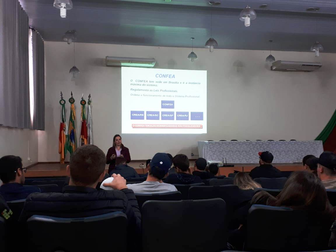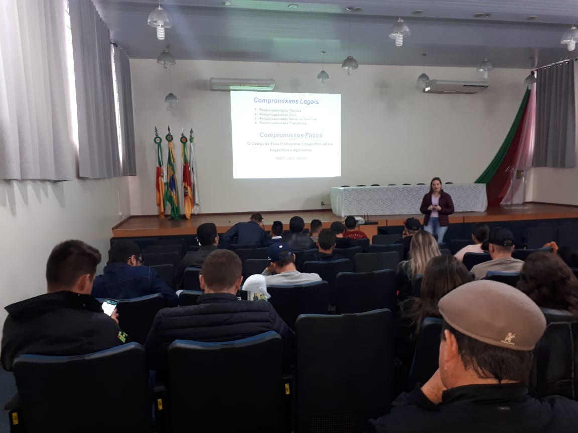 Na ocasião, a Conselheira Cleusa ministrou palestra para os estudantes, no auditório da instituição, sobre as atribuições profissionais; fiscalização das atividades vinculadas ao Conselho; anotação de responsabilidade técnica – ART; Código de Ética Profissional; importância do Registro de Pessoas Físicas e Pessoas Jurídicas no Crea, entre outros assuntos ligados à área de atuação de um Engenheiro Agrônomo.