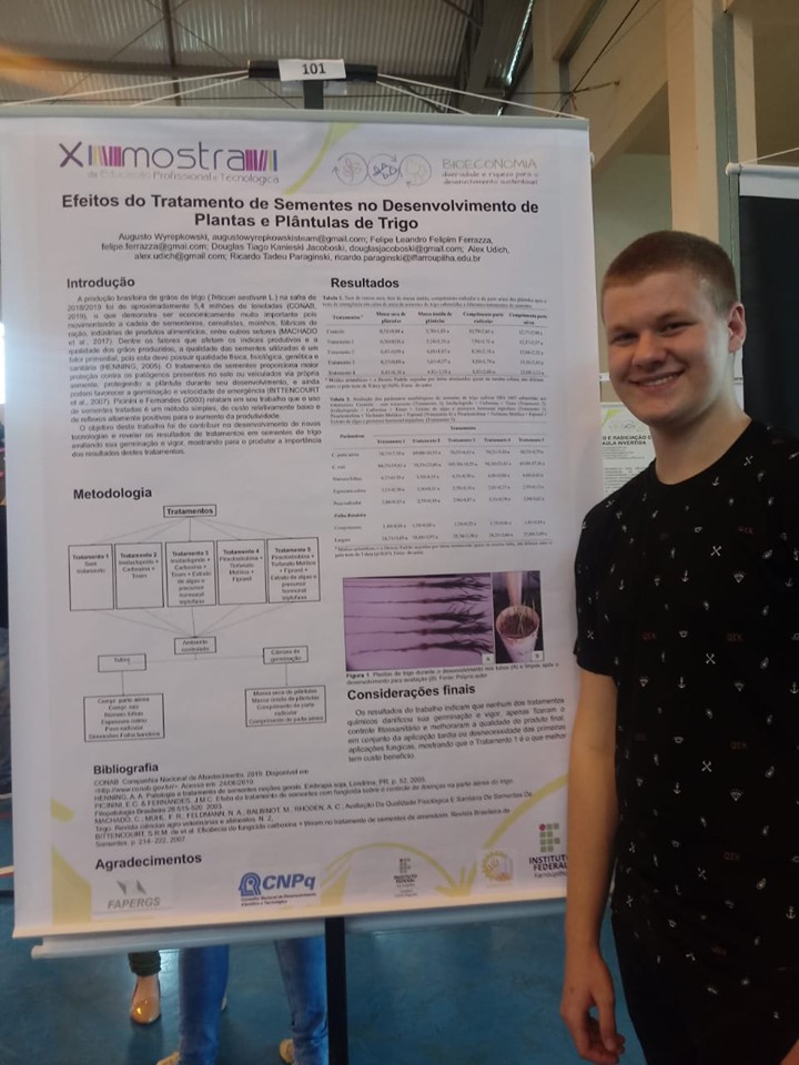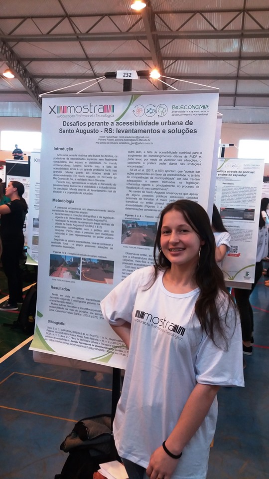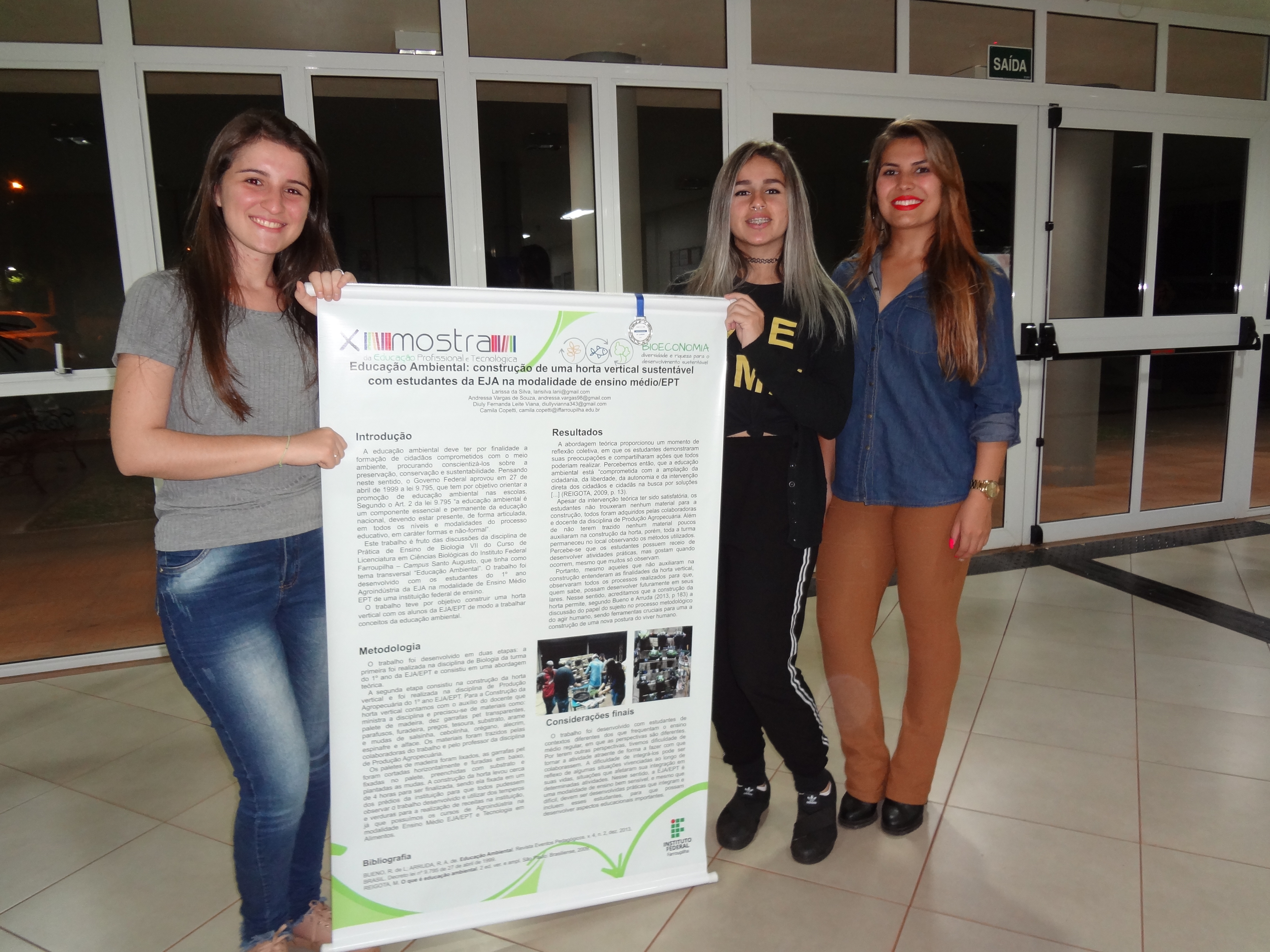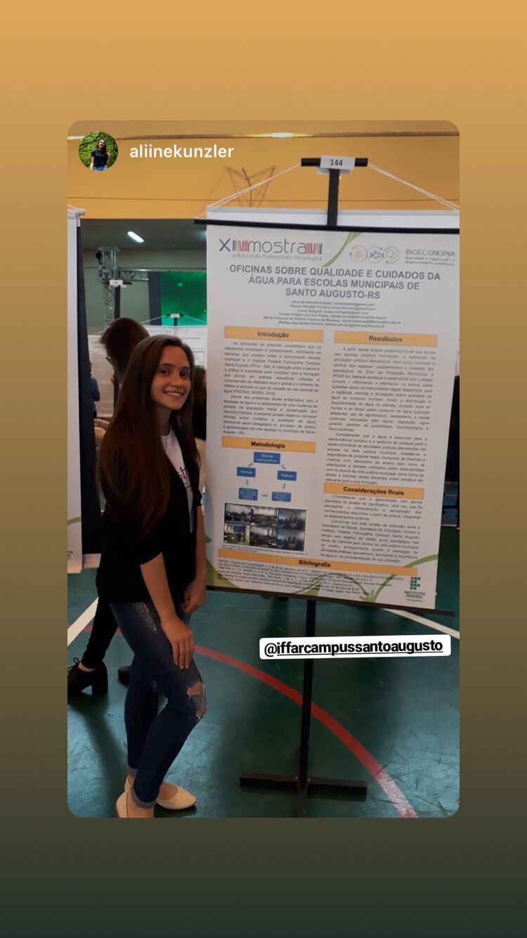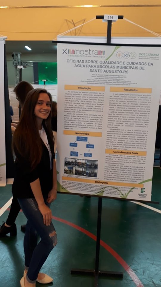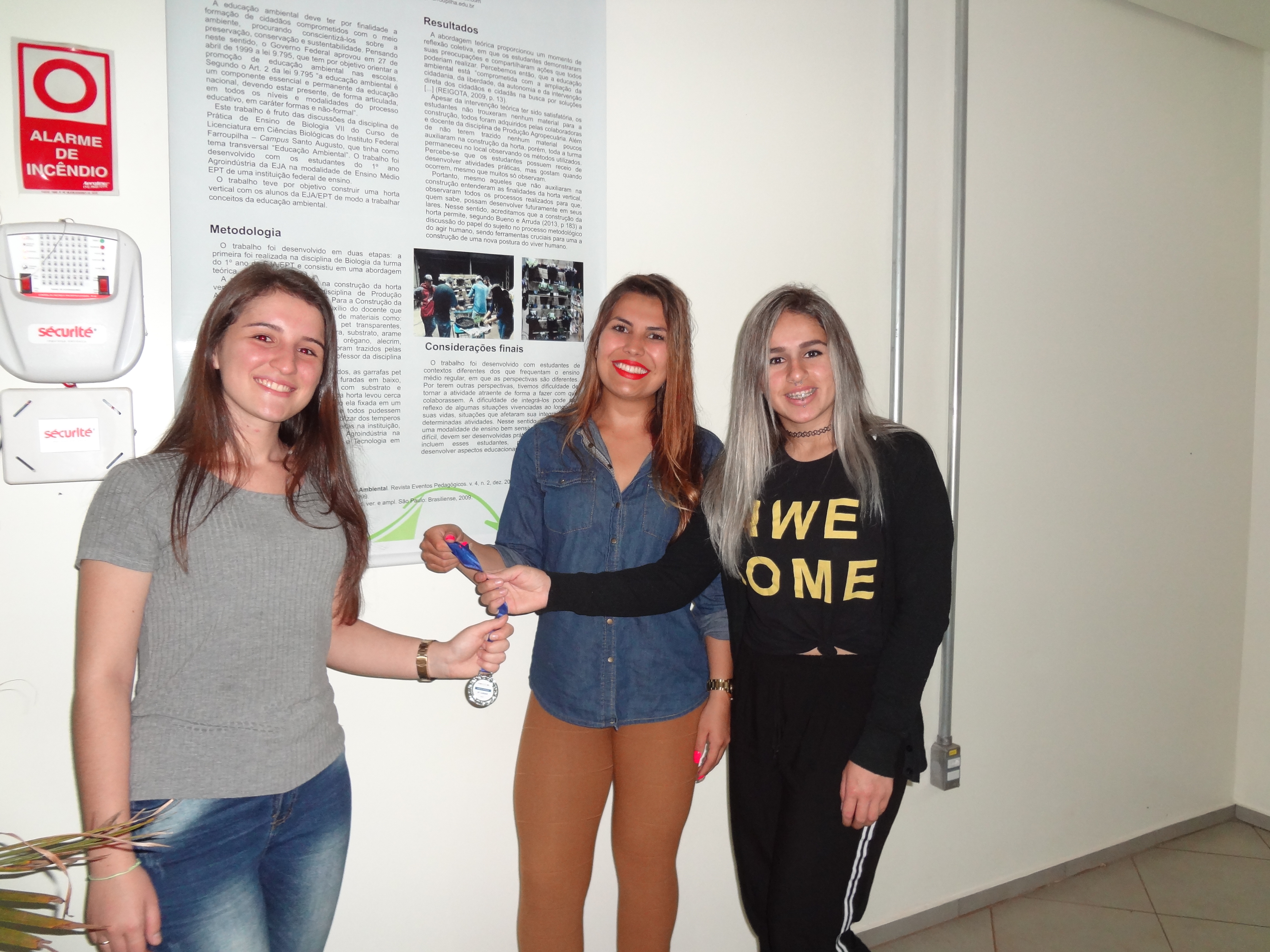 Na modalidade Ensino, a estudante do 8º semestre de Licenciatura em Ciências Biológicas, Larissa da Silva, obteve o 2º lugar, com o trabalho “Educação Ambiental: construção de uma horta vertical sustentável com estudantes da EJA na modalidade de ensino médio/EPT - Campus Santo Augusto”. O trabalho foi produzido juntamente com as colegas Andressa Vargas de Souza e Diuly Fernanda Leite Vianna. O projeto foi desenvolvido com a turma do 1º ano do Curso Técnico em Agroindústria, integrado ao ensino médio na modalidade EJA-EPT, dentro da disciplina de Prática de Ensino Curricular - PEC VII, ministrada pela professora Camila Copetti, que tinha como tema transversal a “Educação Ambiental”, e também da disciplina de Ecologia II, ministrada pela professora Eleonir Diniz, com o apoio do professor Tarcísio Samborski, que ministra a disciplina de Práticas Agrícolas na Agroindústria.